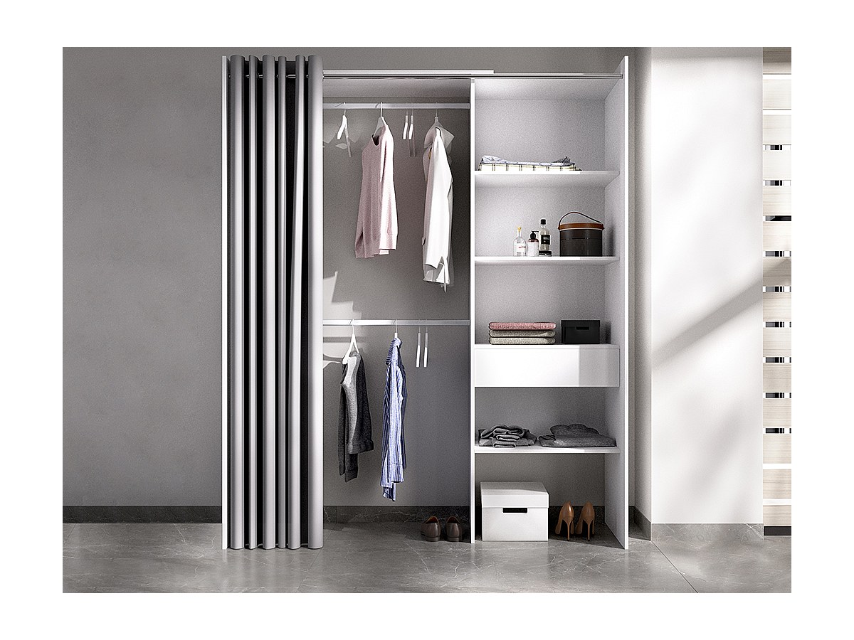 Das Kleiderschranksystem LAURENT besteht aus einer doppelten Garderobe und einem Wäscheschrank mit 4 Einlegeböden und einer Schublade. Mit diesen zahlreichen Stauräumen lassen sich alle Ihre Sachen unterbringen und effizient ordnen. Der Vorhang bringt einen Hauch von Moderne in Ihren Raum. Praktisch und modern, das Kleiderschranksystem LAURENT wird Ihr täglicher Verbündeter sein.