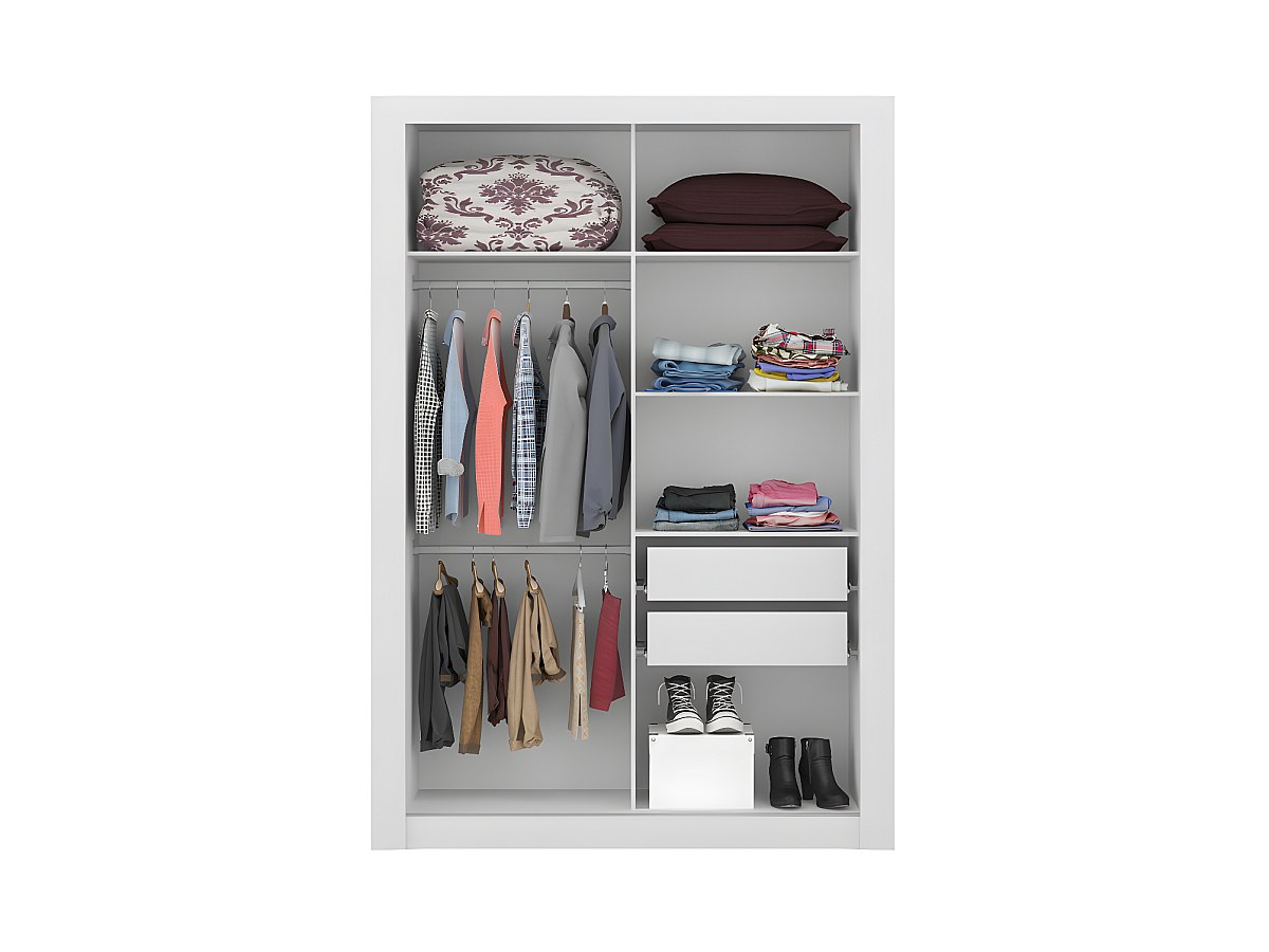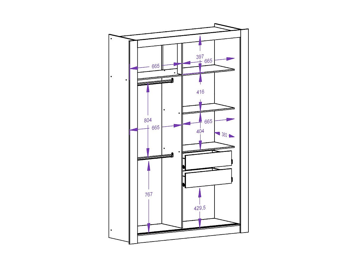 - Innen: 2 Kleiderleisten, 5 Regale, 2 Schubladen