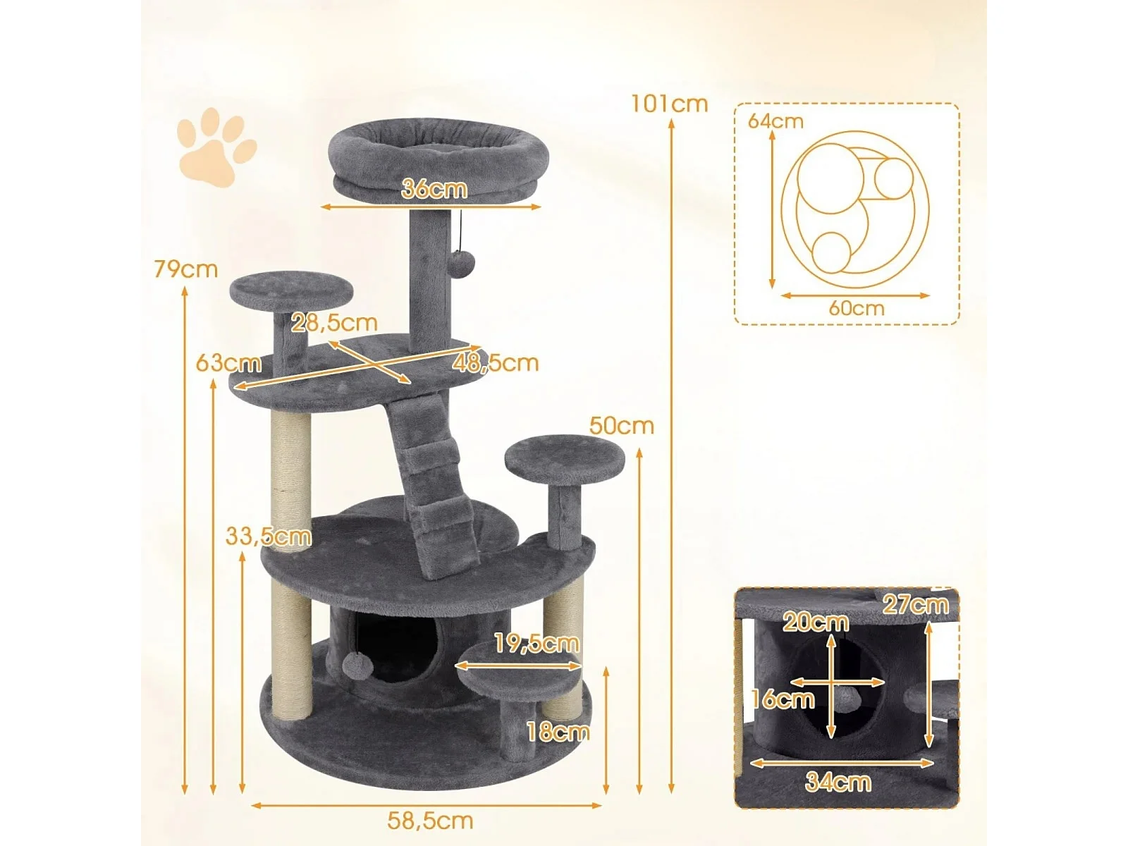 Klein Kratzbaum mit Katzenhöhle & Ball & Leiter Holz Katzenbaum Katzenkratzbaum Grau