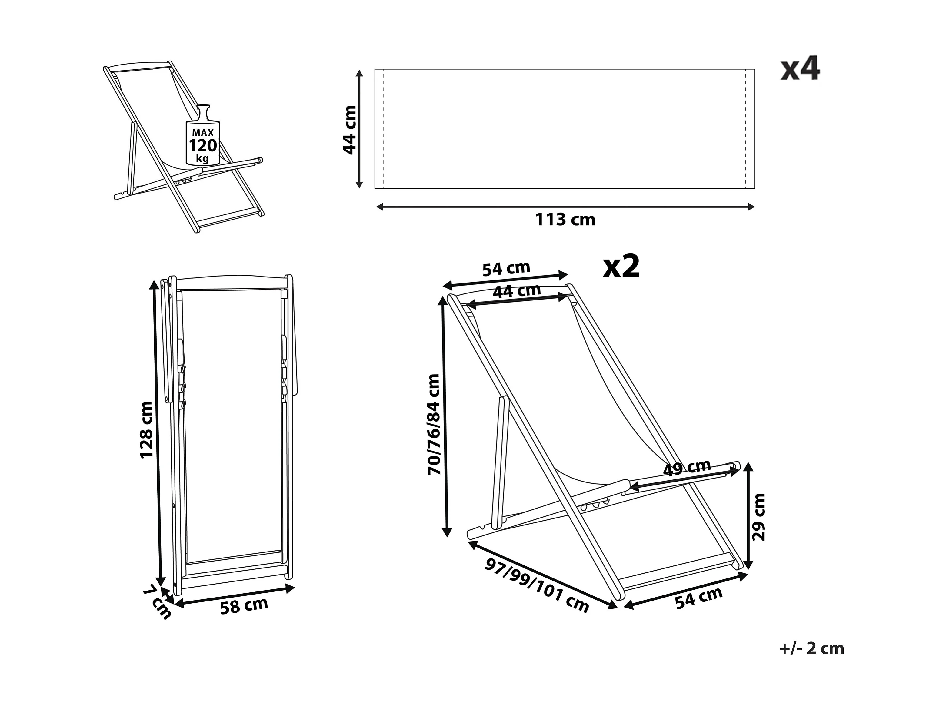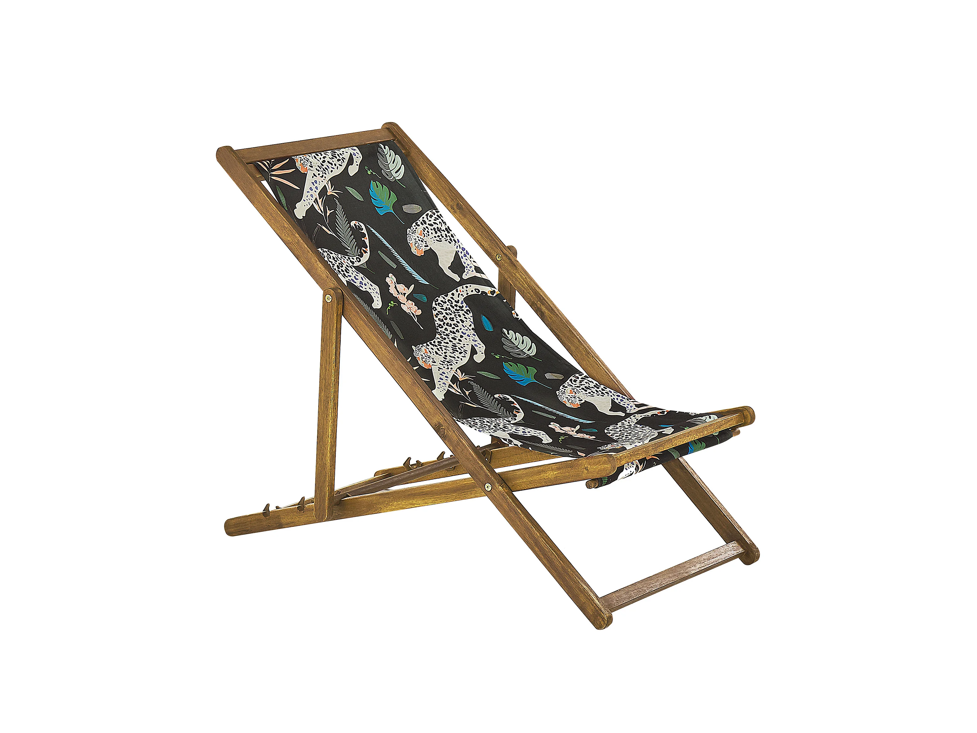 Zwei Liegestühle aus hellem Akazienholz Stoffbezüge Gepardenmotiv schwarz Anzio