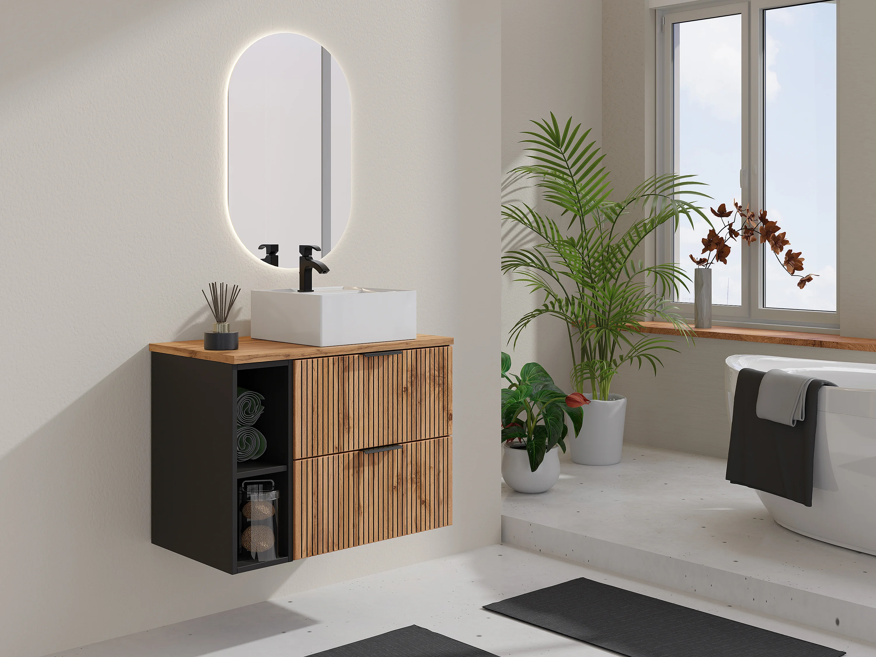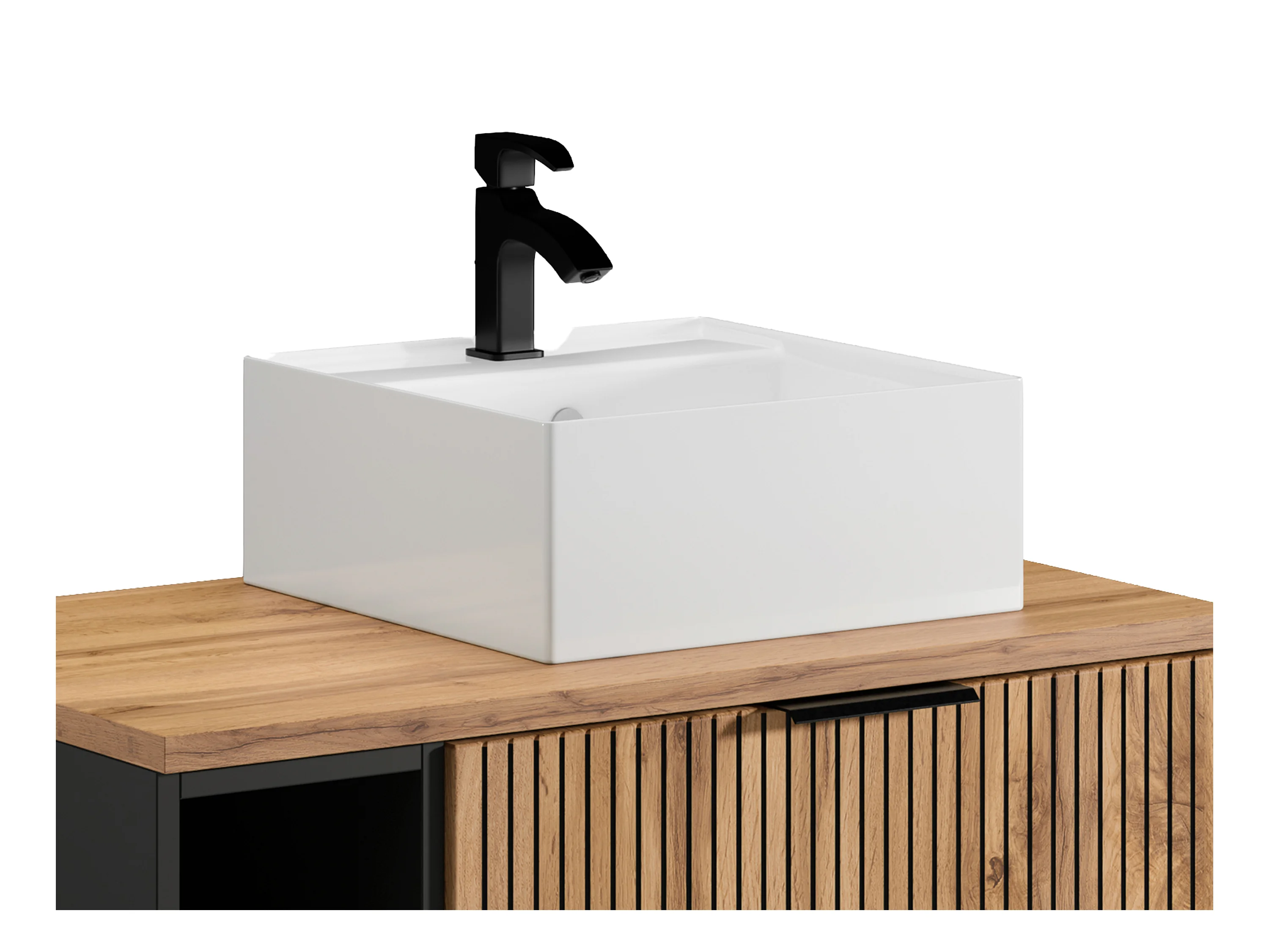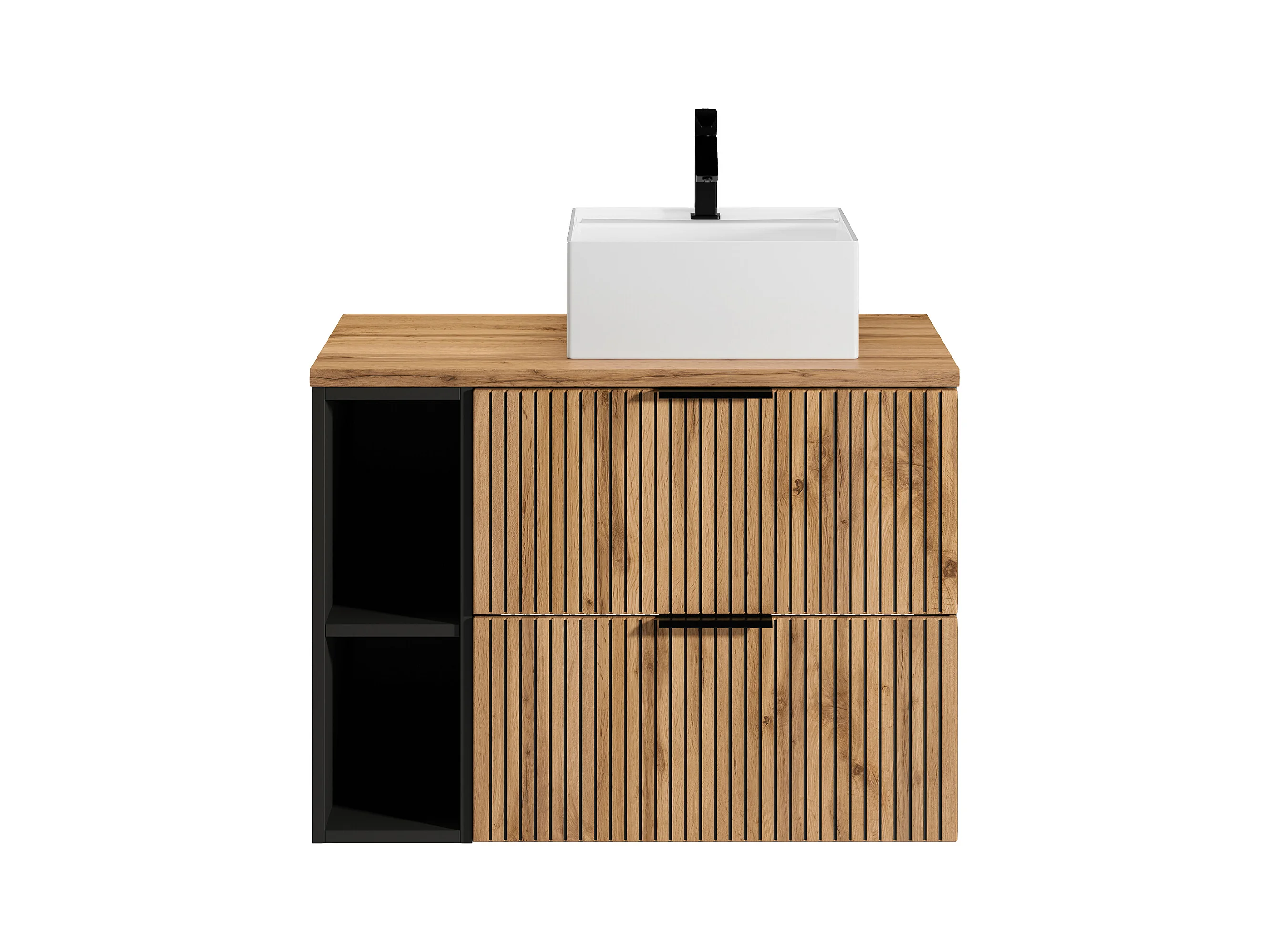 Waschbeckenunterschrank hängend mit Ablagen & Aufsatzwaschbecken quadratisch - Streifenoptik - Holzfarben hell - 80 cm - MADELA