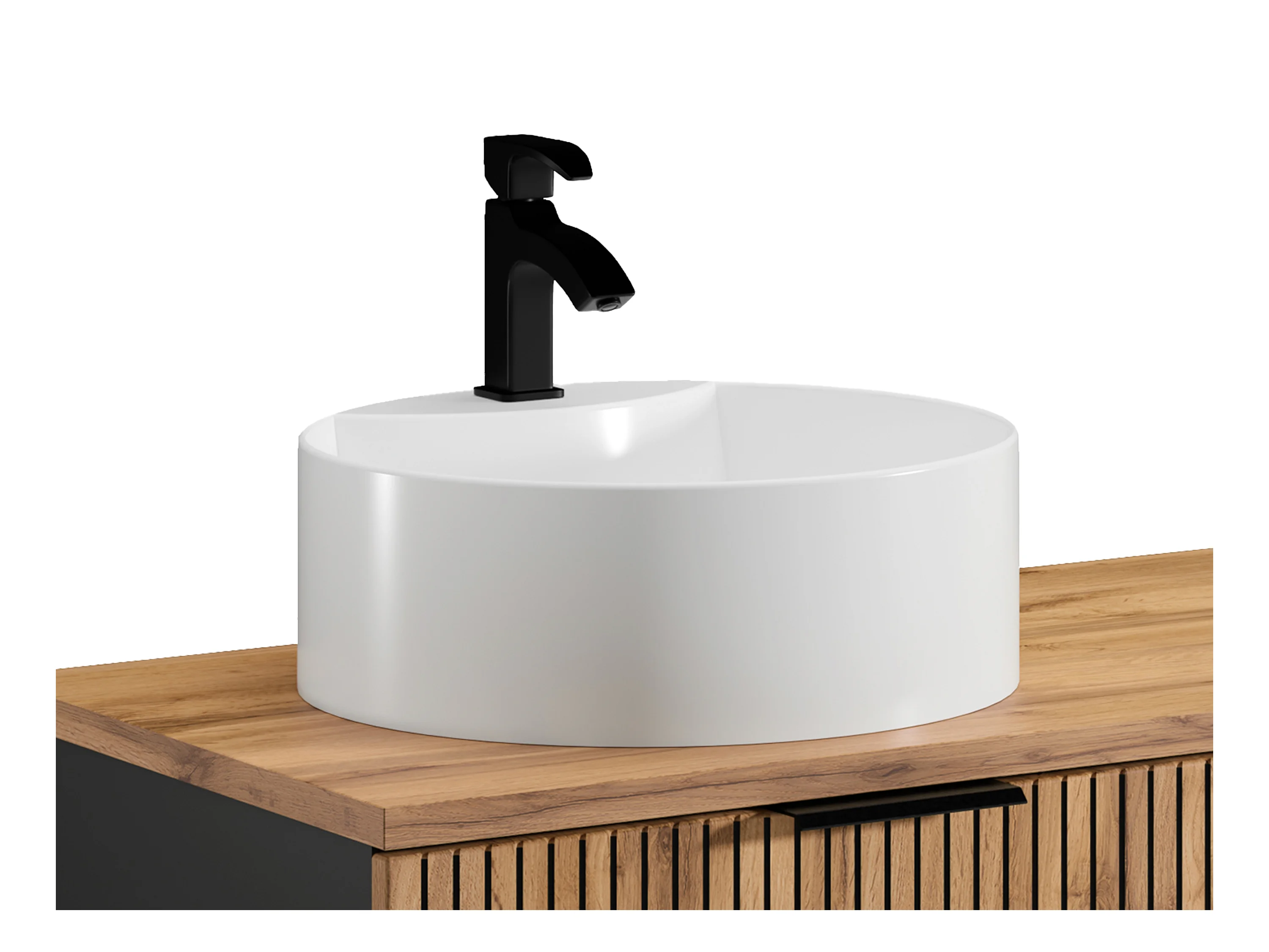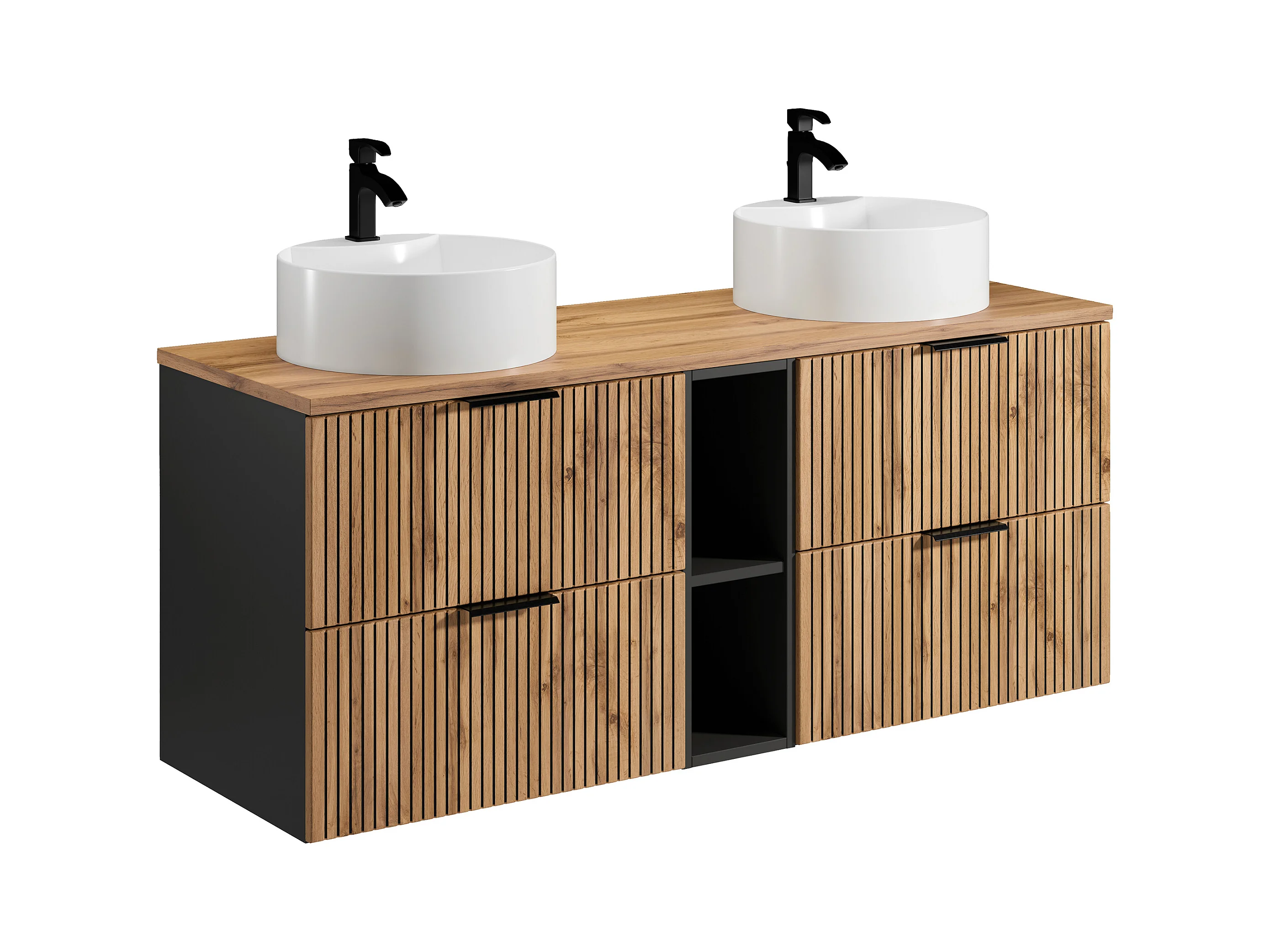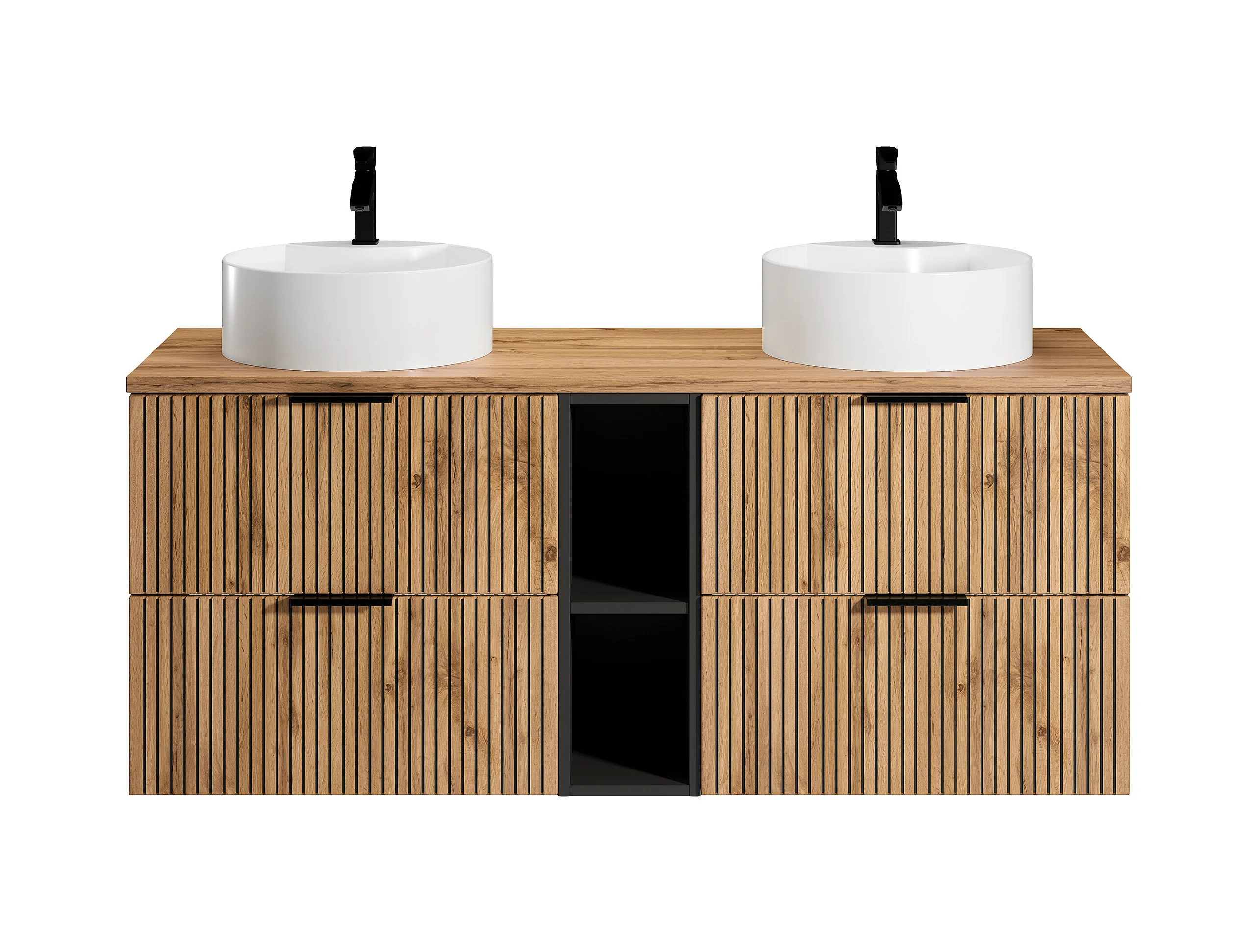 Waschbeckenunterschrank hängend mit Ablagen & Doppelaufsatzwaschbecken rund - Streifenoptik - Holzfarben hell - 140 cm - MADELA