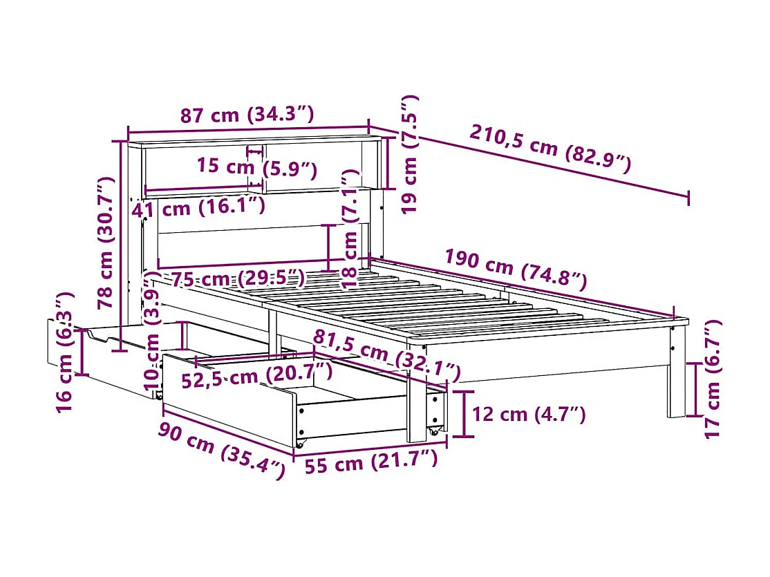 Bücherregalbett ohne Matratze 75x190 cm Massivholz Kiefer
