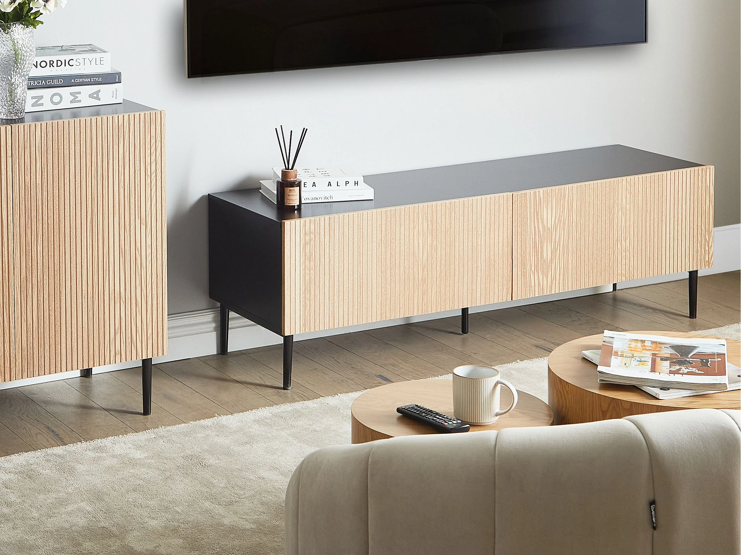 Moderner TV-Möbel mit 2 Schubladen MDF Helles Holz Gerippte Front Wohnzimmer Schwarz Blythe