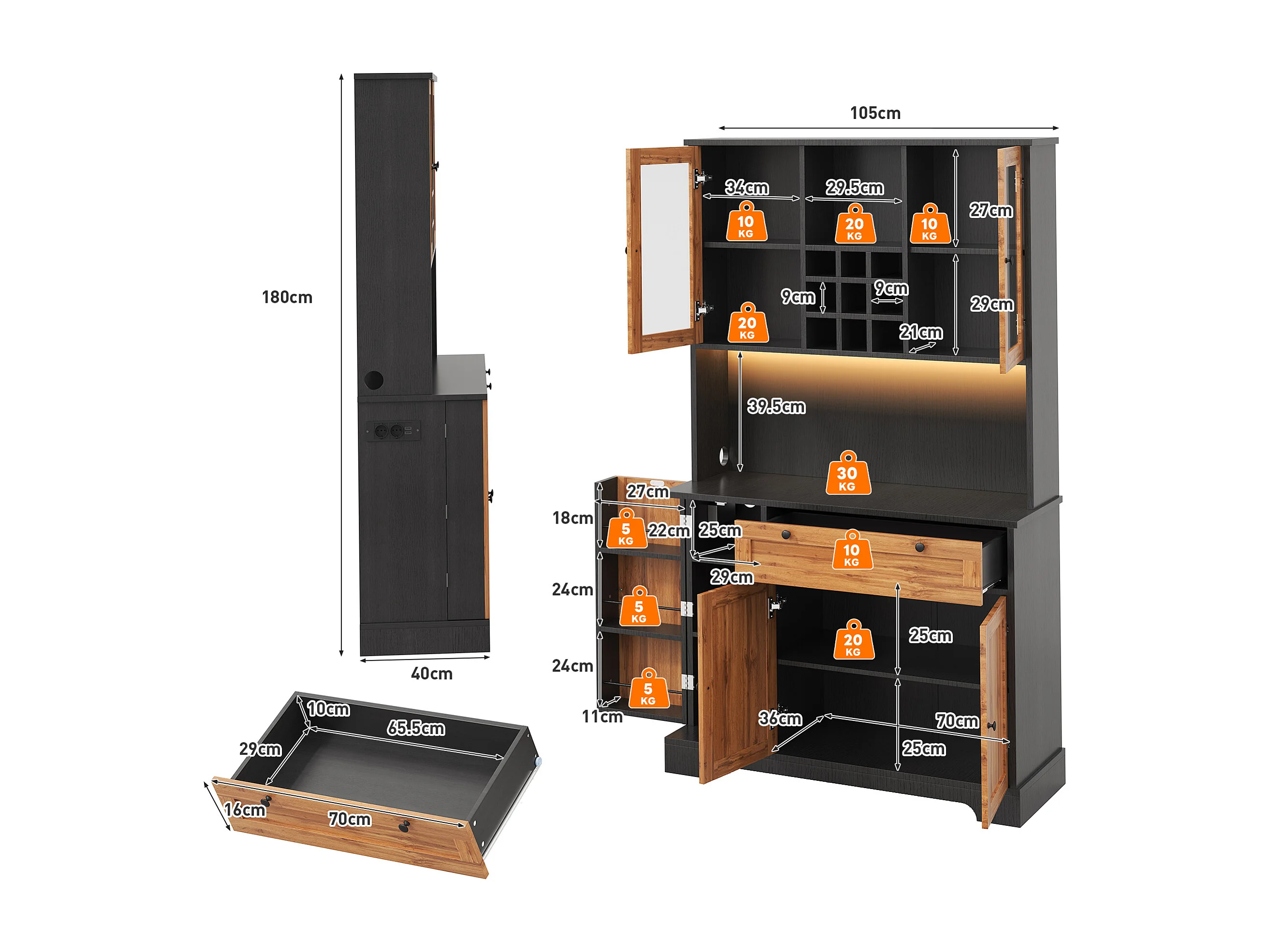 Modernes Küchenbuffet 100x40x180cm - mit Steckdose und LED - mit 1 Schublade und 5 Türen - mit Gewürzregal - Natur
