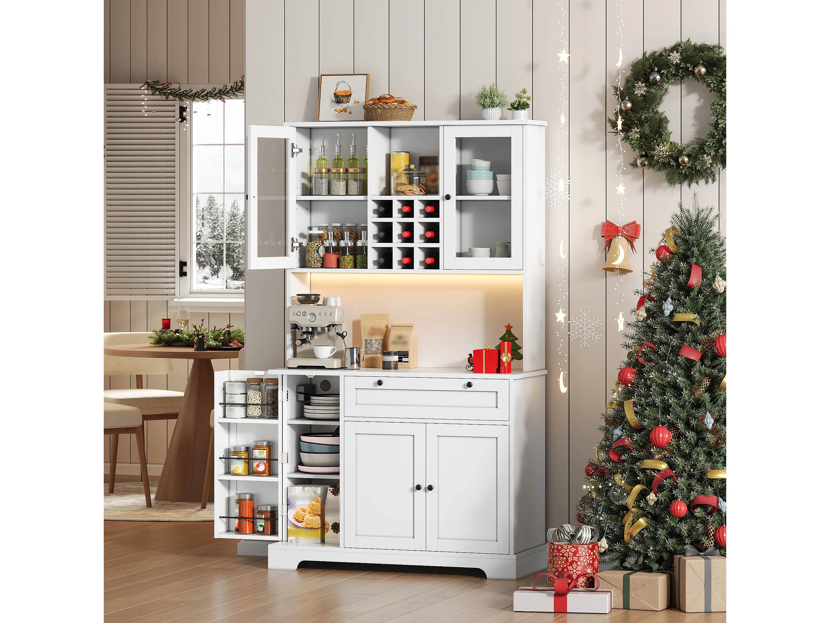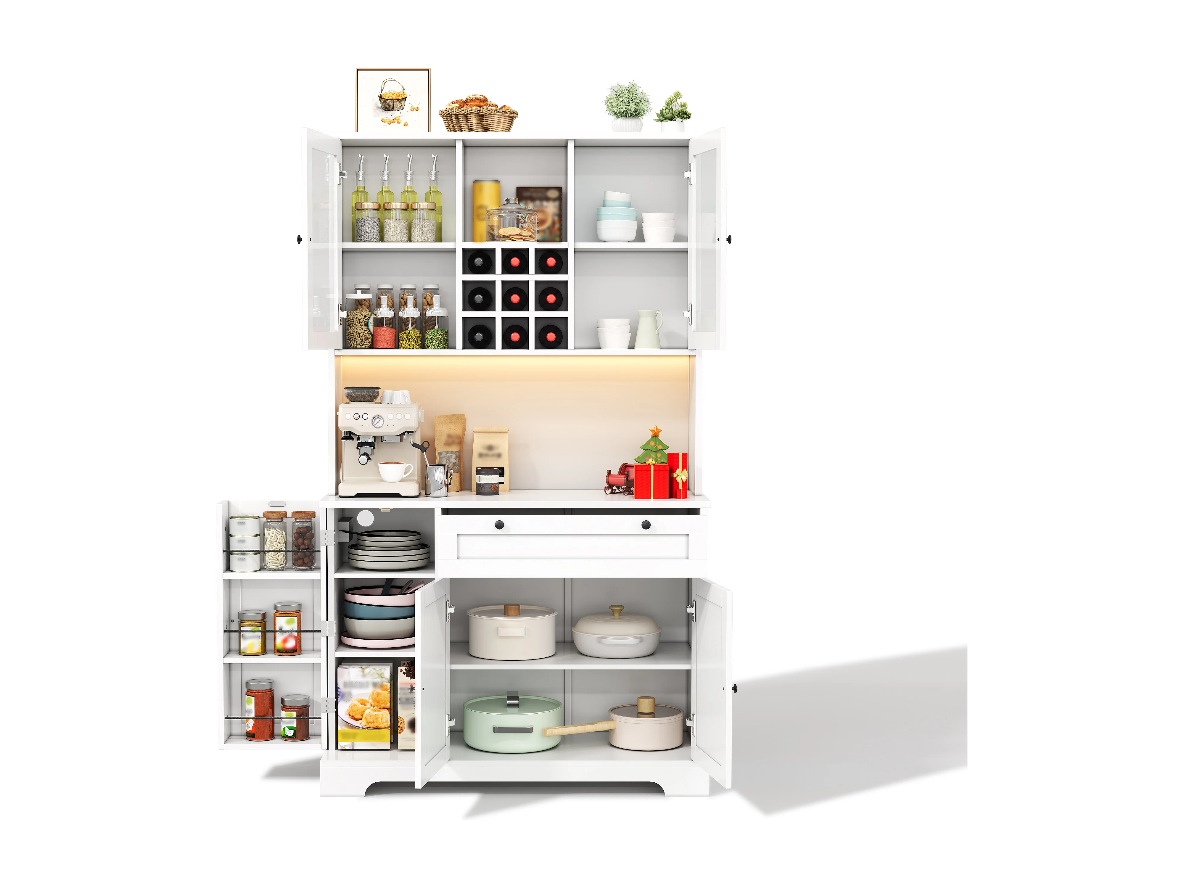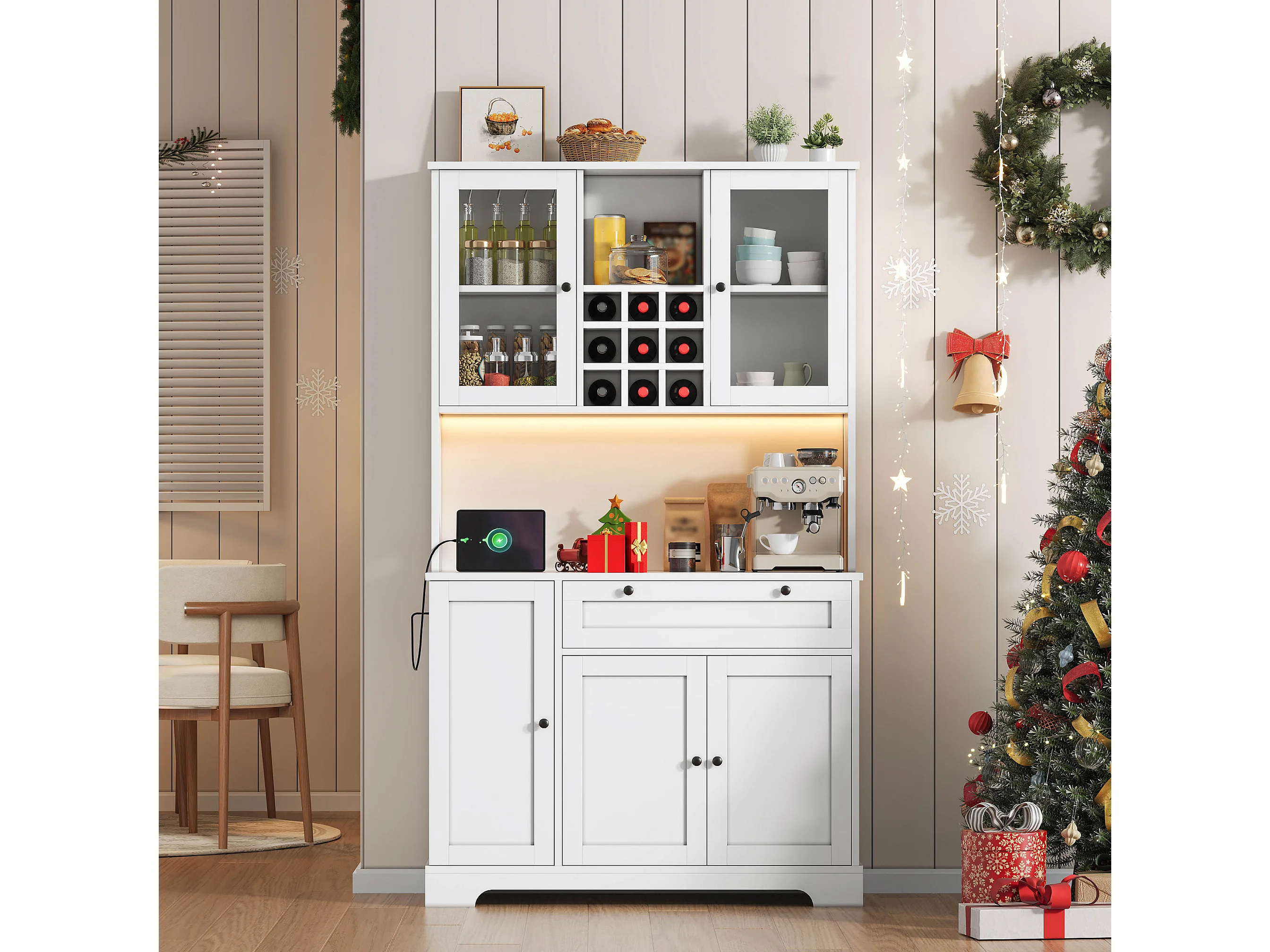 Modernes Küchenbuffet 100x40x180cm - mit Steckdose und LED - mit 1 Schublade und 5 Türen - mit Gewürzregal - Weiß