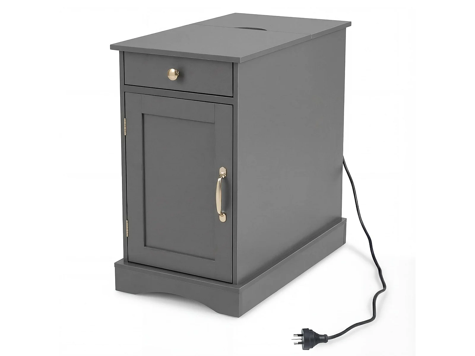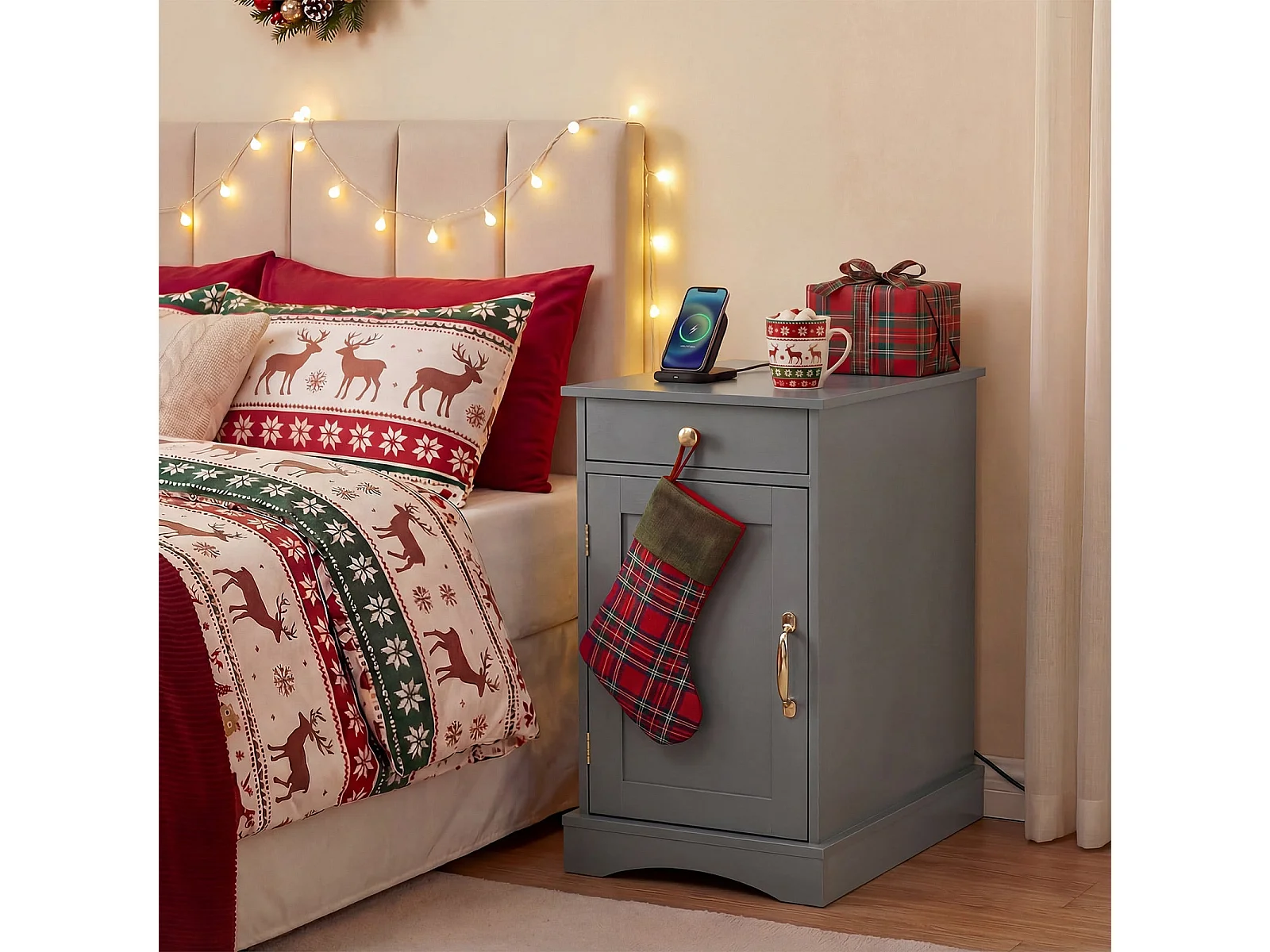 Nachttisch mit Ladestation Beistelltisch mit Verstellbarem Regal Holz Nachtschrank Grau