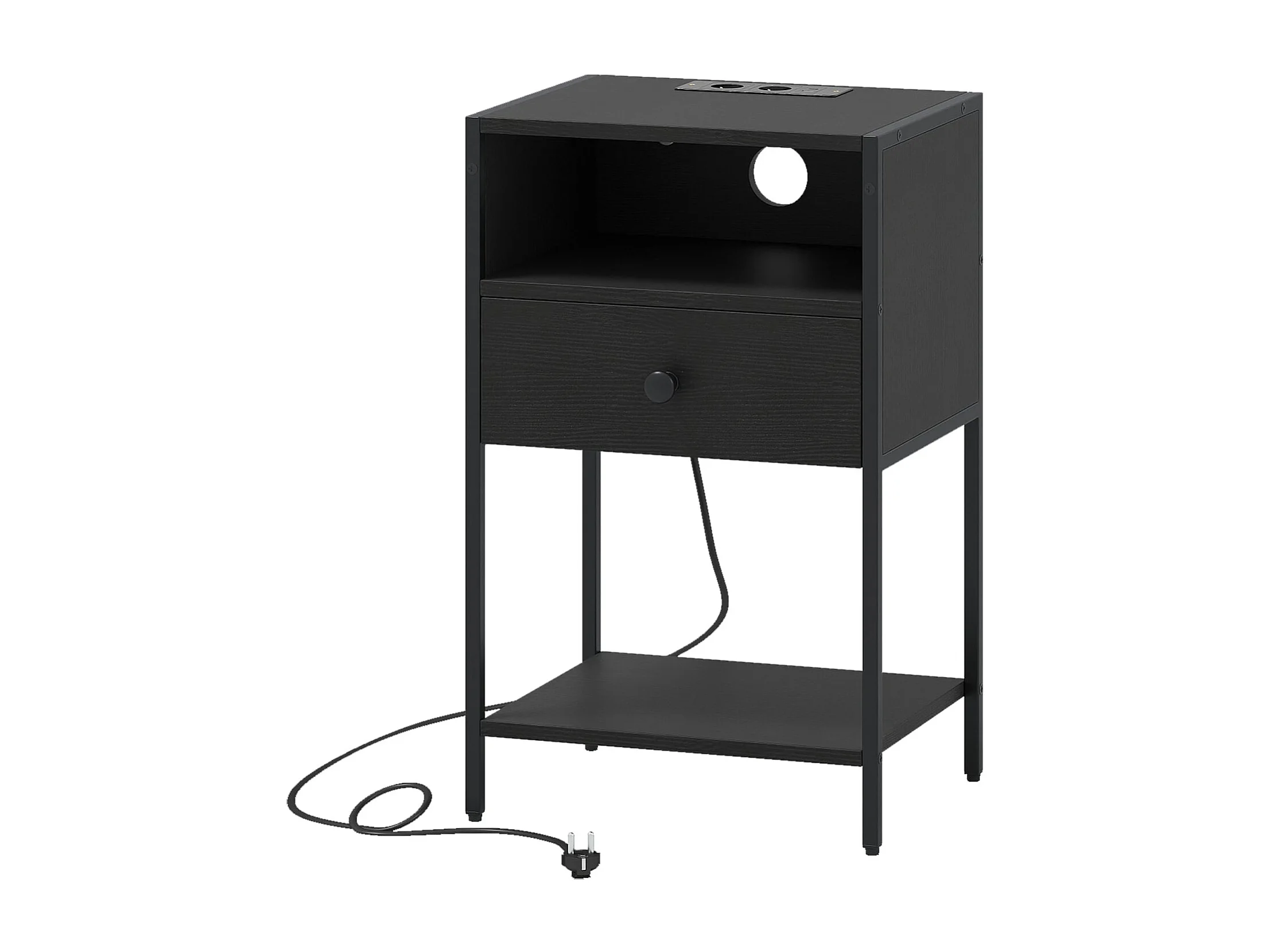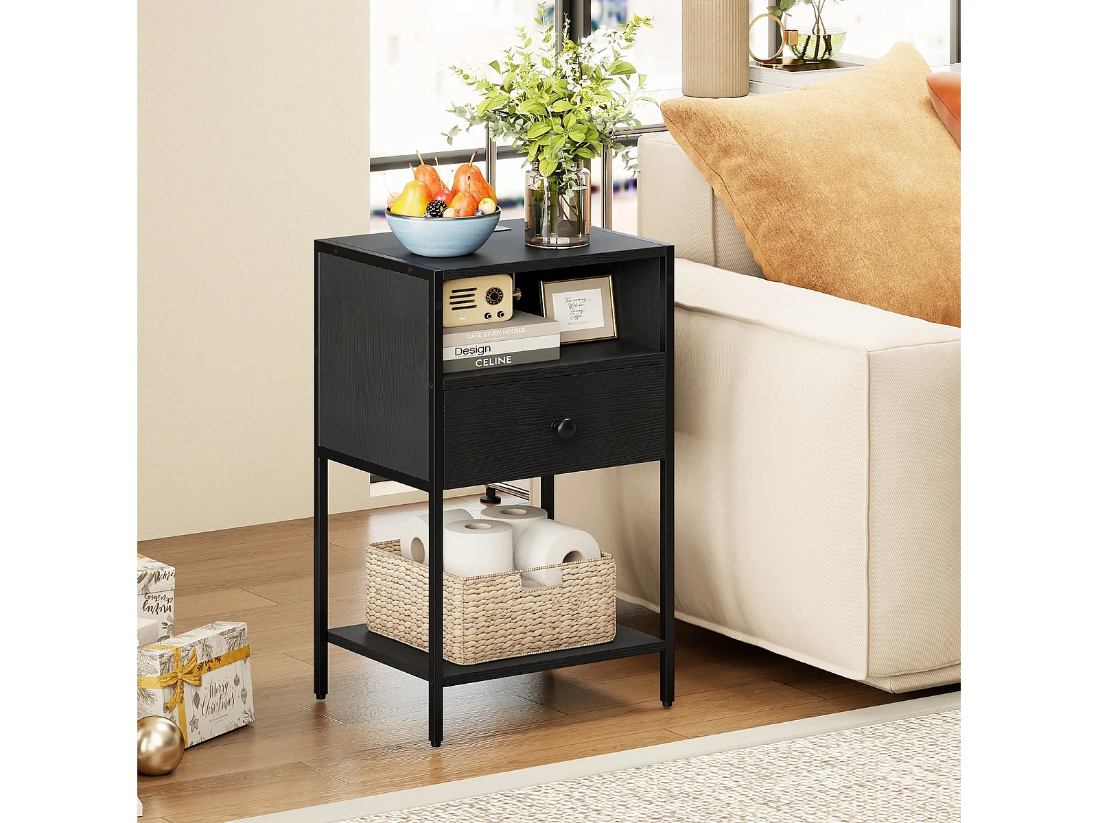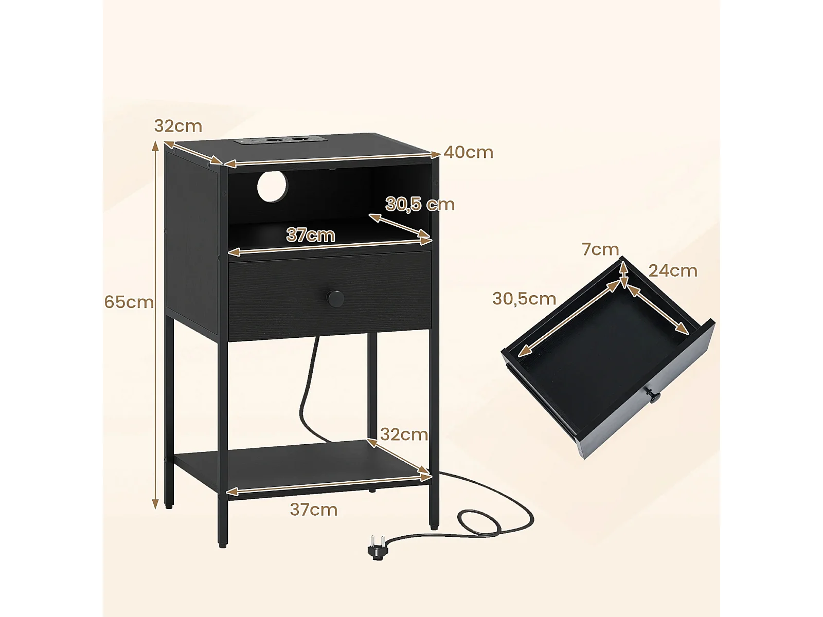 Nachttisch mit Ladestation Industrial Beistelltisch mit offenem Fach Schublade & Ablage kompakter Nachttisch Schwarz