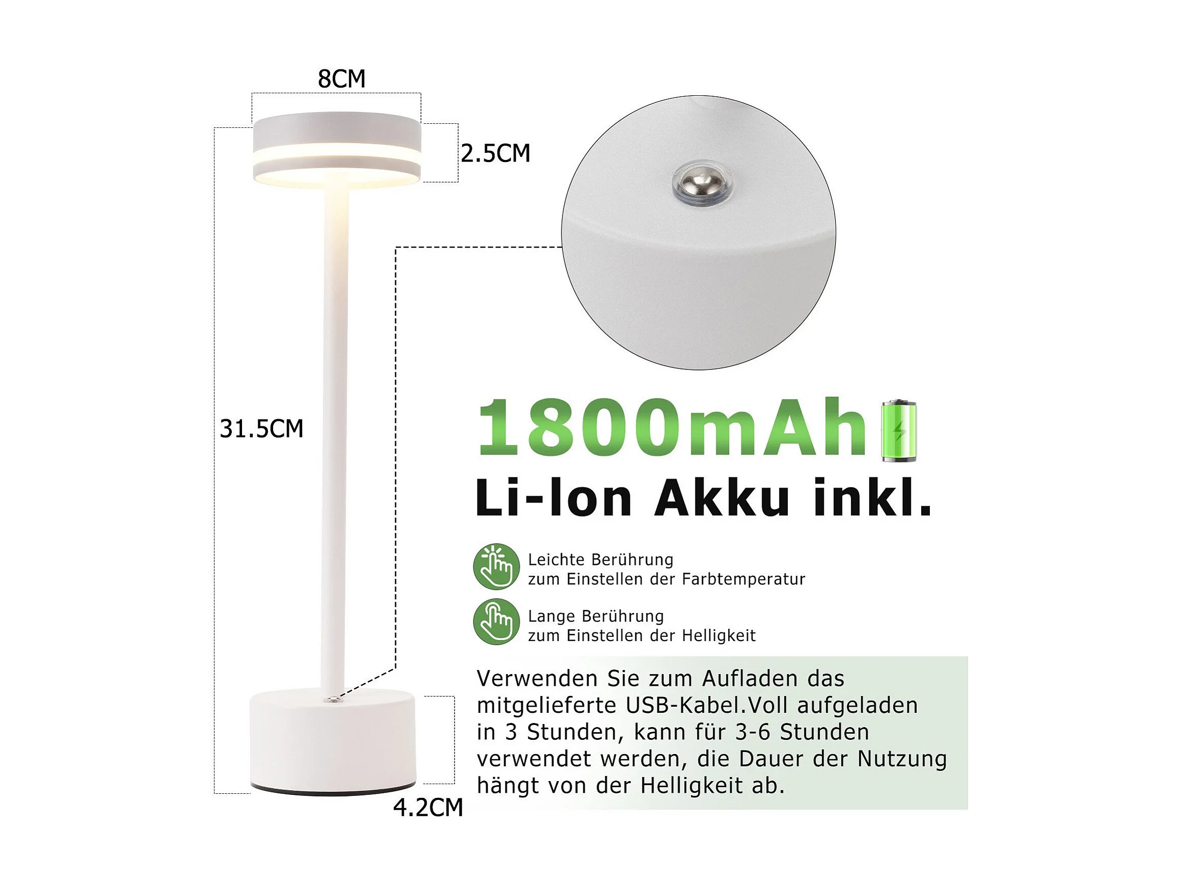 NETTLIFE Nettlife Kabellose LED-Tischlampe, dimmbare Nachttischlampe mit USB-C-Akku, weiße Touch-Lampe für Schlafzimmer