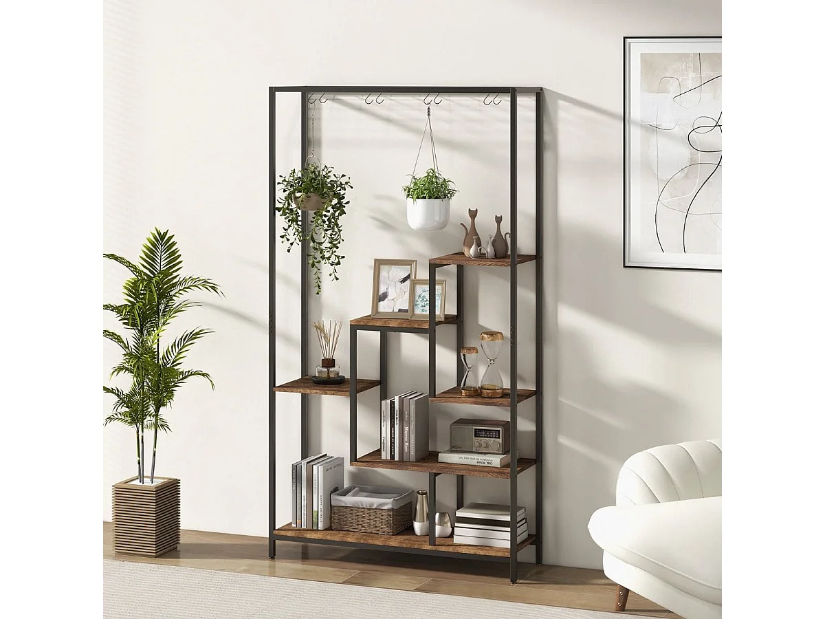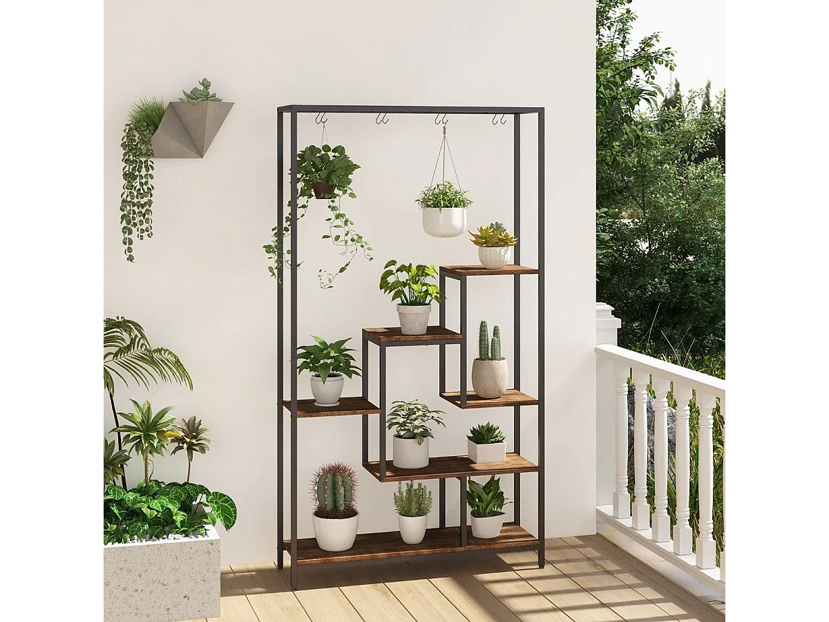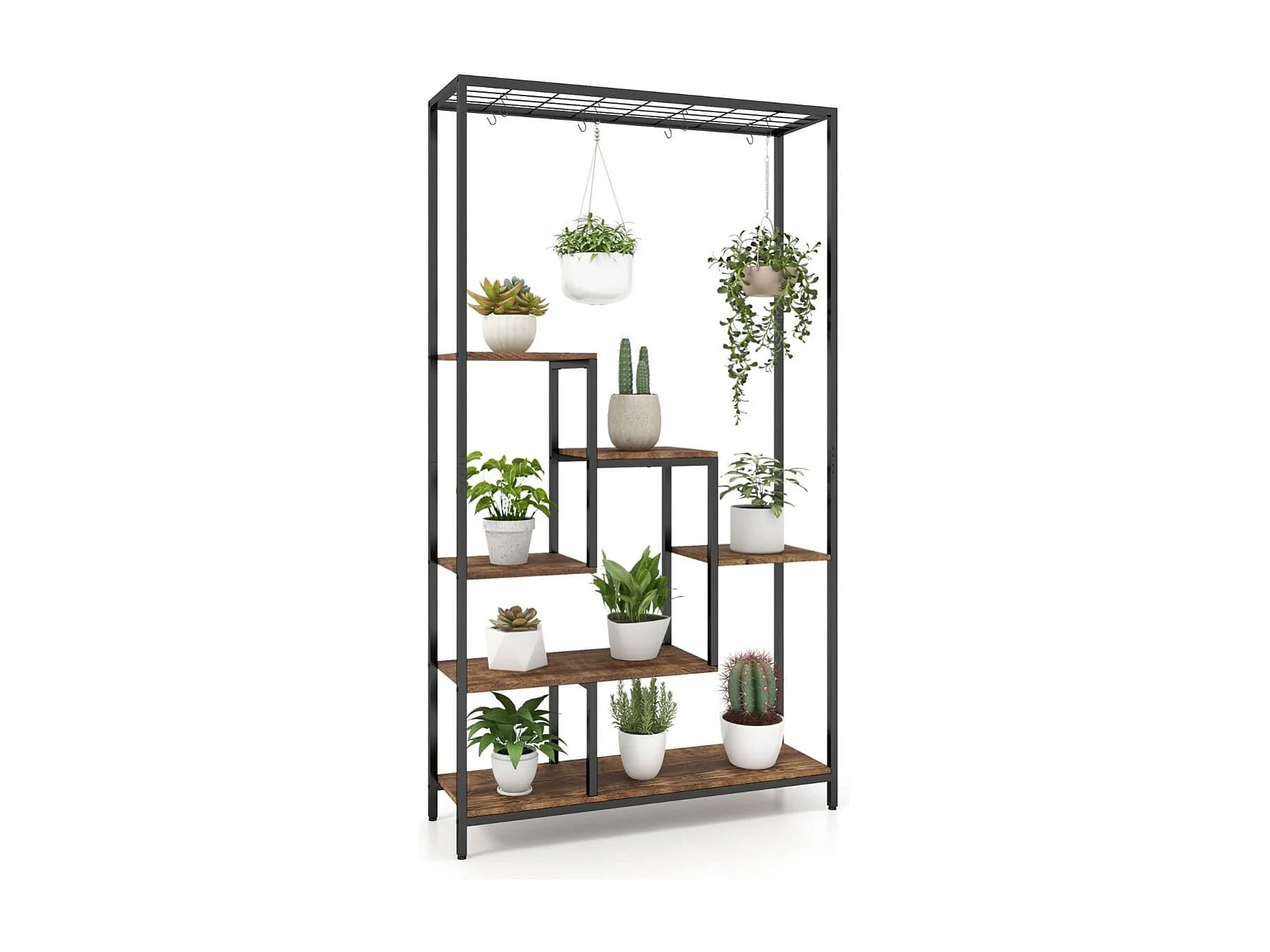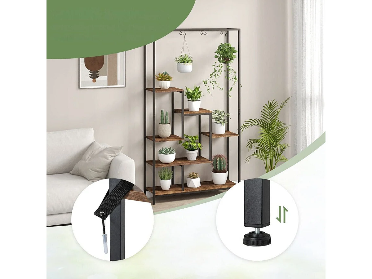 Pflanzenständer 6 Etagen 180 cm Pflanzenregal Metall mit 10 S-Haken Schwarz + Rustikales Braun