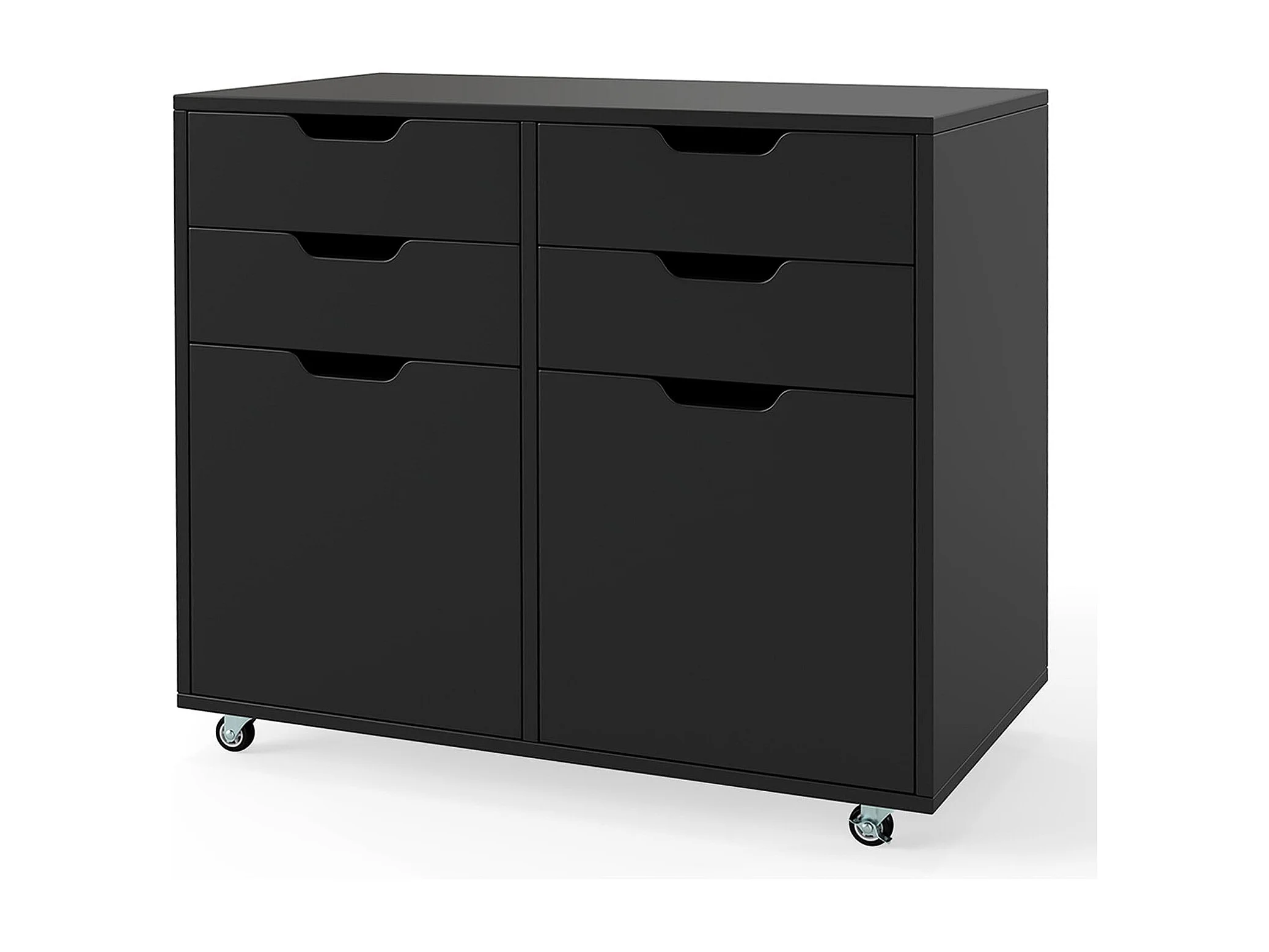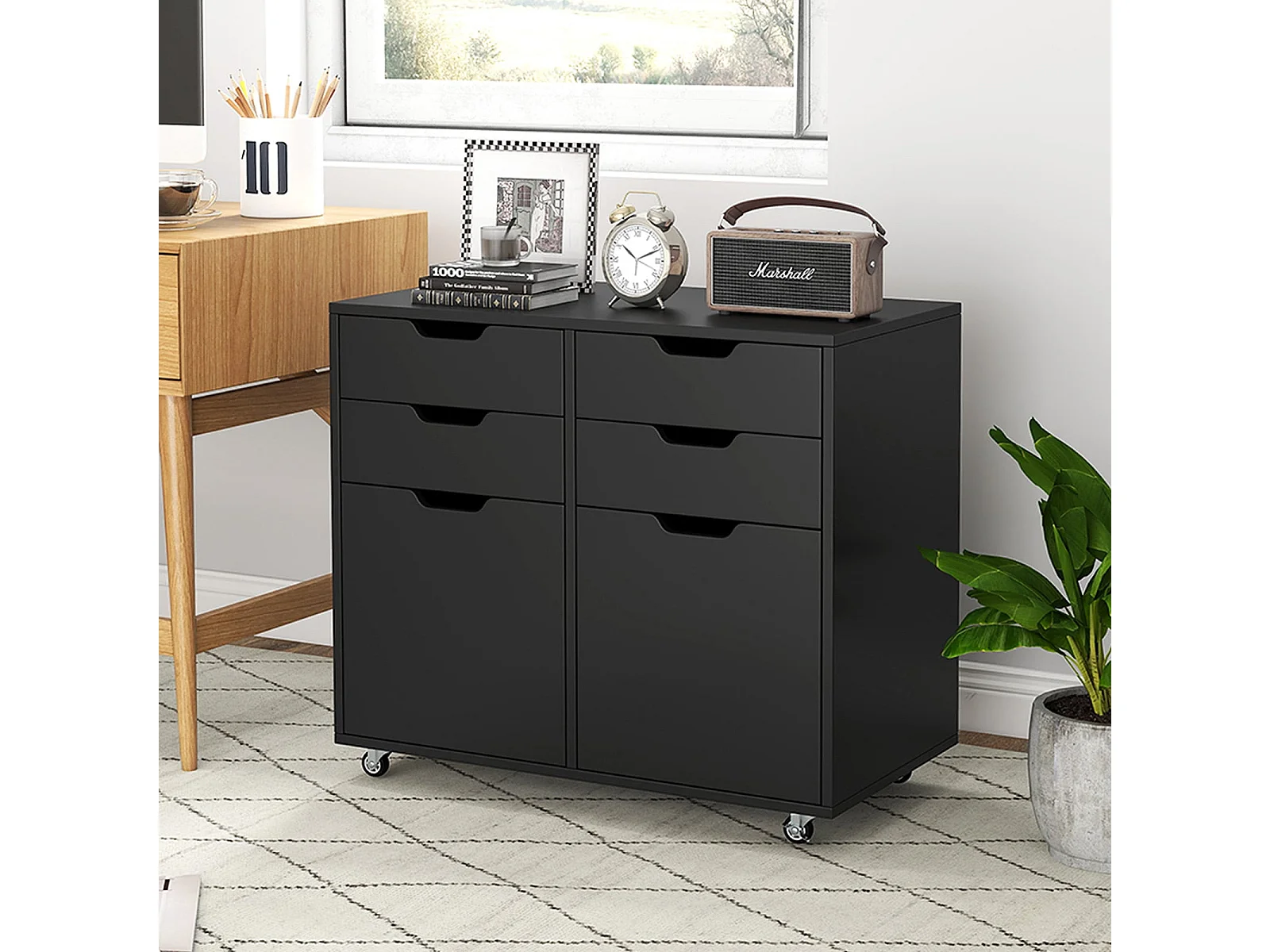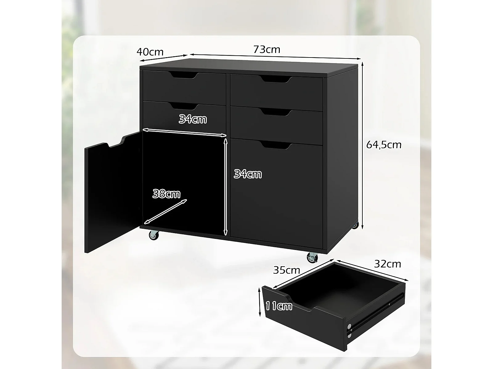 Rollcontainer mit 4 Schubladen & 2 Türen Aktenschrank mit Rollen Druckerständer Schwarz