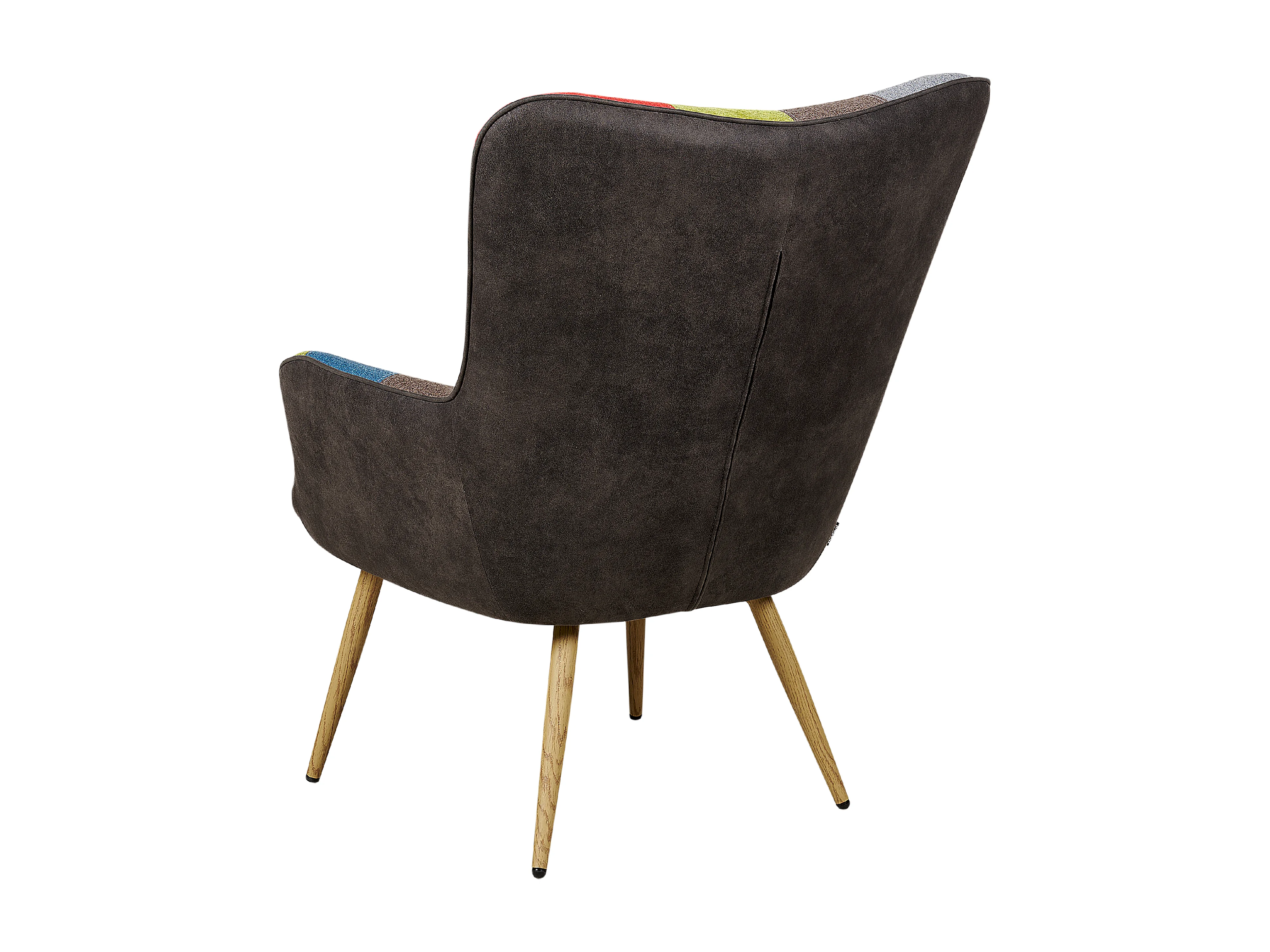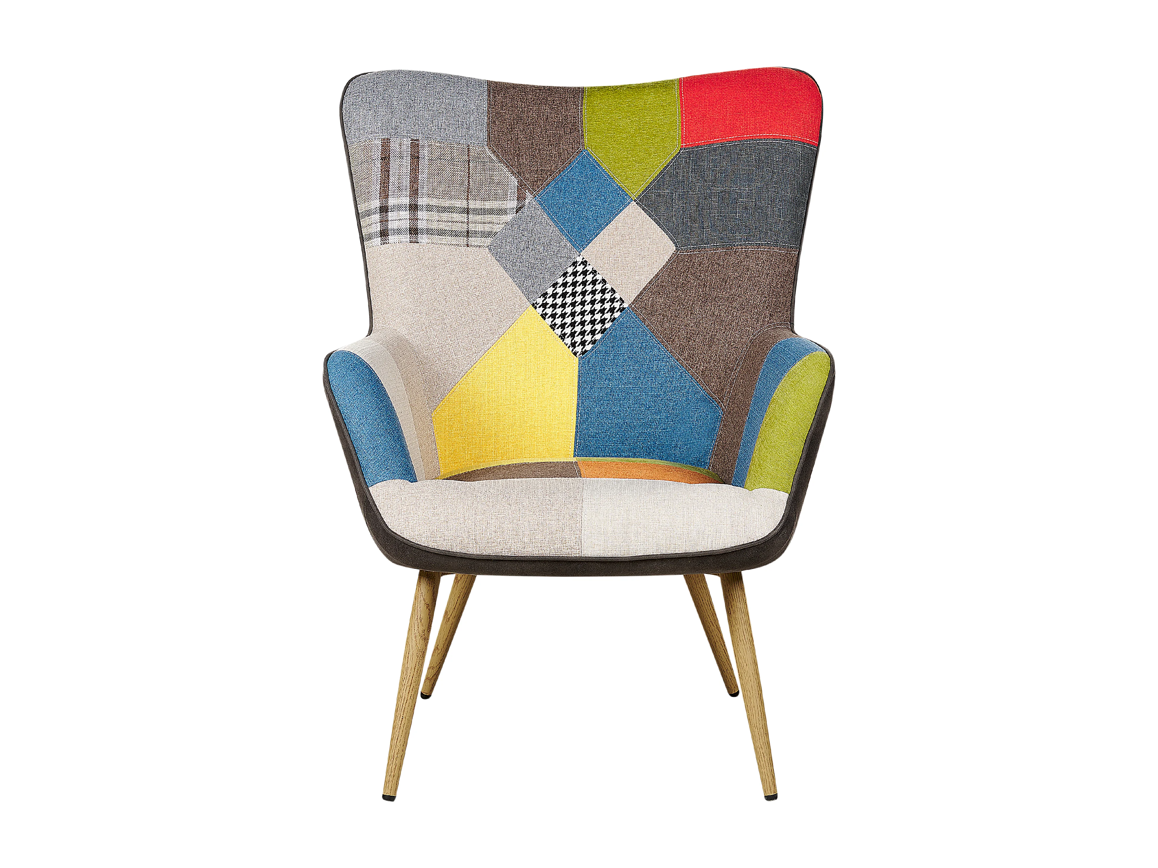Sessel Patchwork bunt blau Ohrensessel mit schwarzen Holzbeinen Retro-Stil Molde