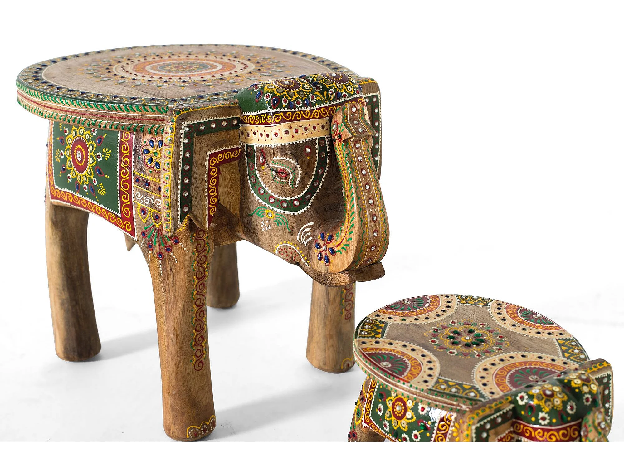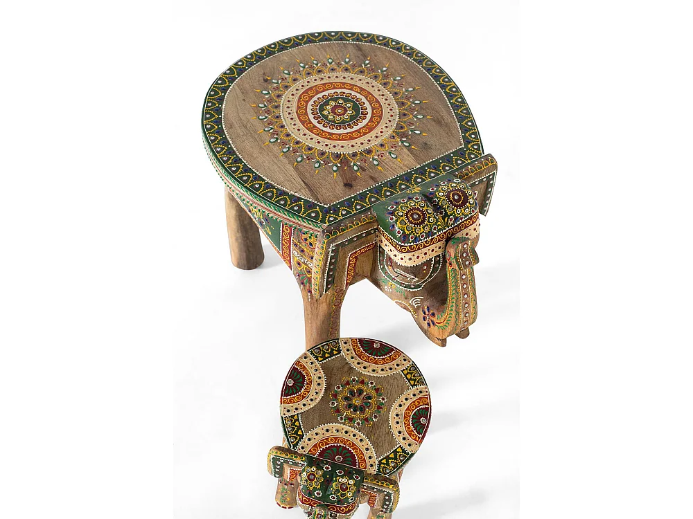 Set aus 2 handgeschnitzten und bemalten Elefantenfiguren aus Mangoholz