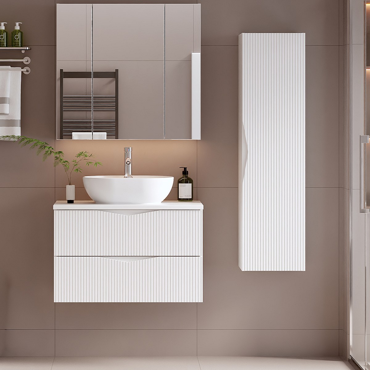 Waschbeckenunterschrank hängend mit Einbauwaschbecken & Badhochschrank - Streifenoptik - Weiß matt - 60 cm - ZEVINI