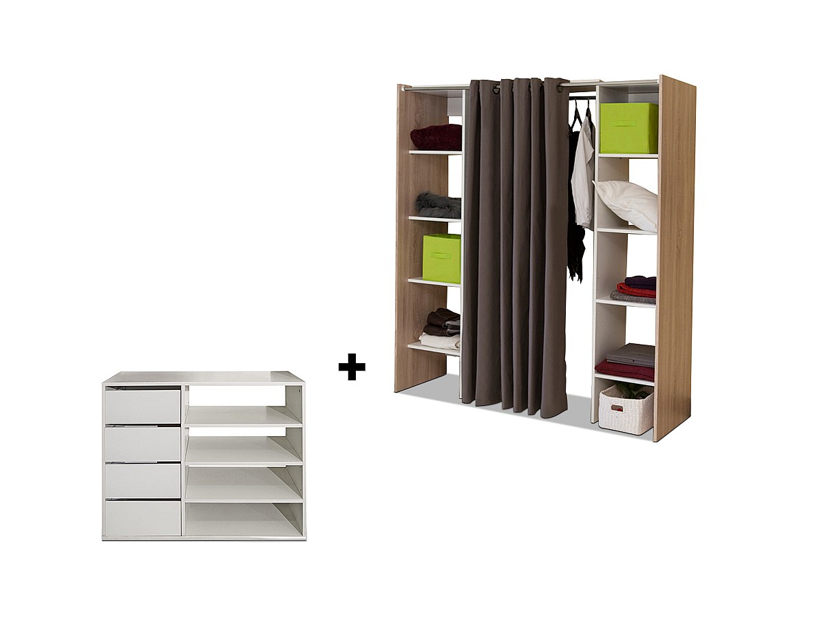 Das Sparset: Kleiderschranksystem mit Kommode EMERIC setzt sich aus dem Kleiderschranksystem Emeric mit Vorhang und einer Kommode zusammen, wo Sie all Ihre Besitztümer verstauen können. Passt sich perfekt in Ihr Zimmer ein!
