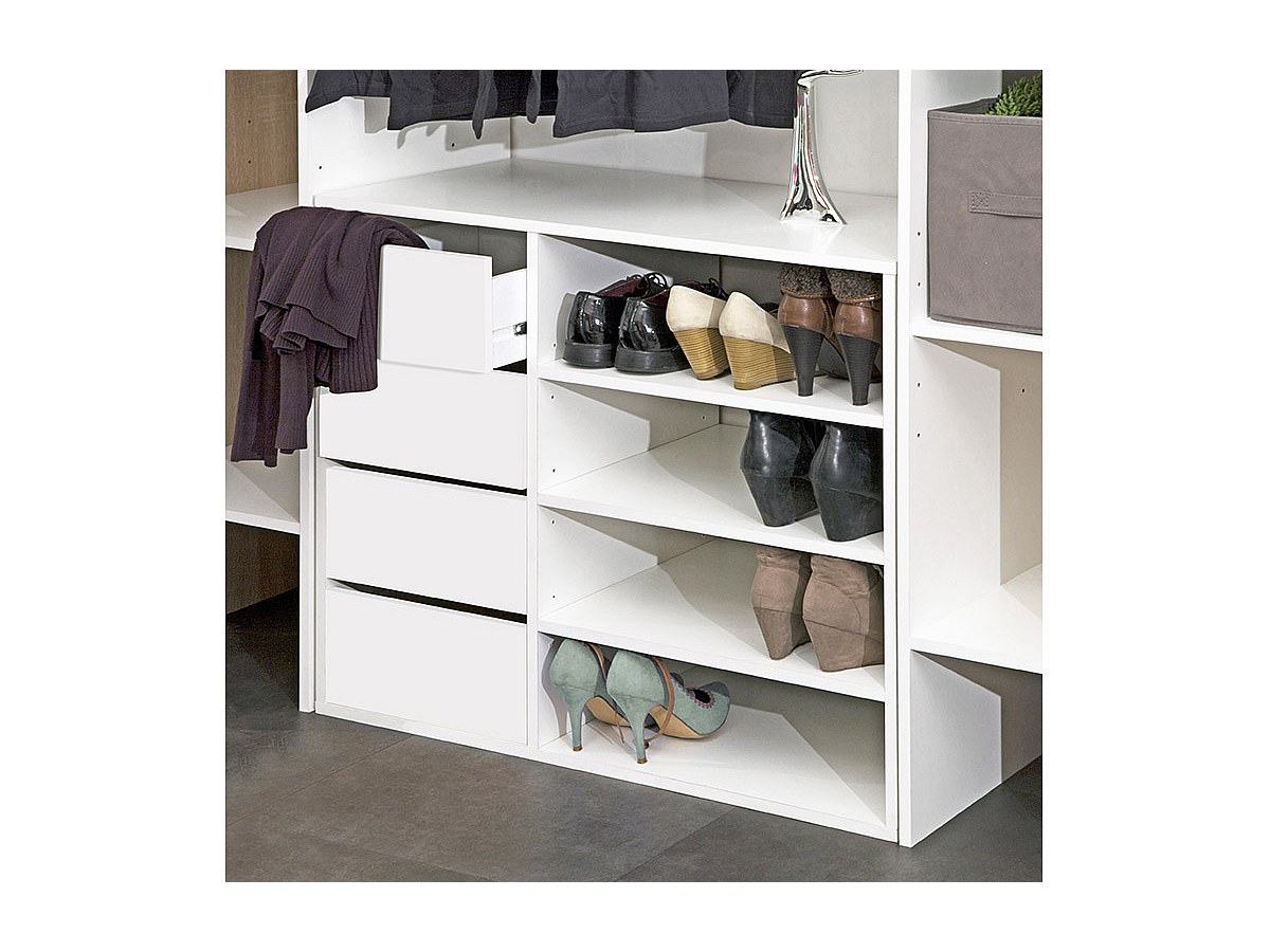 Der Kleiderschrank Emeric ist bis zu 185 cm ausziehbar und verfügt über 2 Seitenschränke, sowie einem begehbaren Mittelteil mit Kleiderstange. Jeder Seitenschrank verfügt über 4 Ablagefächer, von denen 2 verstellbar sind und bietet somit genügend Stauraum für Kleidung und andere Utensilien. Die dazu passende Kommode verfügt über 4 Schubladen und 4 Ablagefächer, welche als Stauraum, aber auch als Schuhregal genutzt werden können.