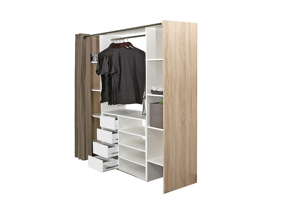 - Aufbau: 2 Seitenschränke mit je 4 Ablagefächern (2 feste & 2 verstellbare), 1 Kleiderstange, 1 Vorhang