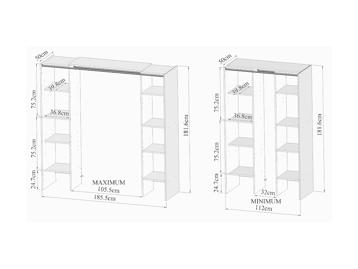 - Maße Kleiderschrank: B 112-185 cm x T 50 cm x H 182 cm