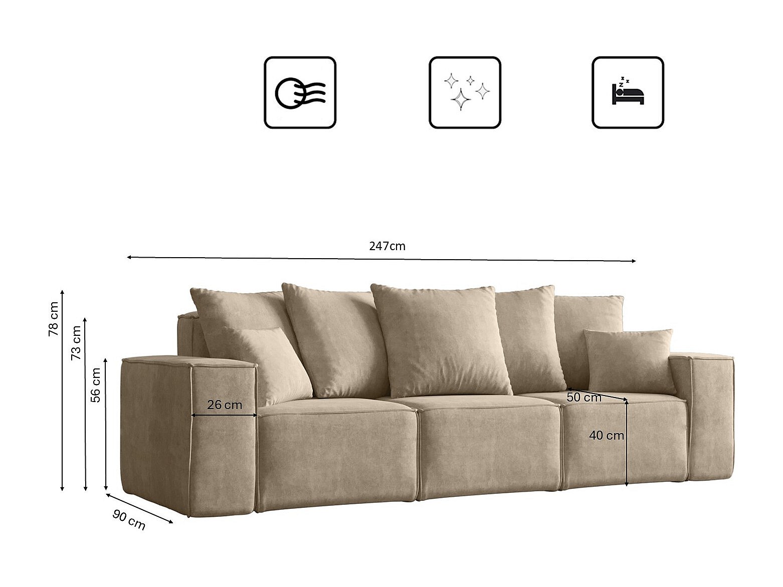 Sofa, Dreisitzer Couch ELLA, Stoff Noel, Hellbeige