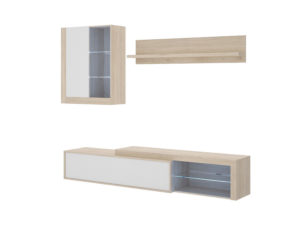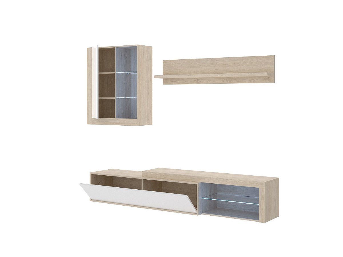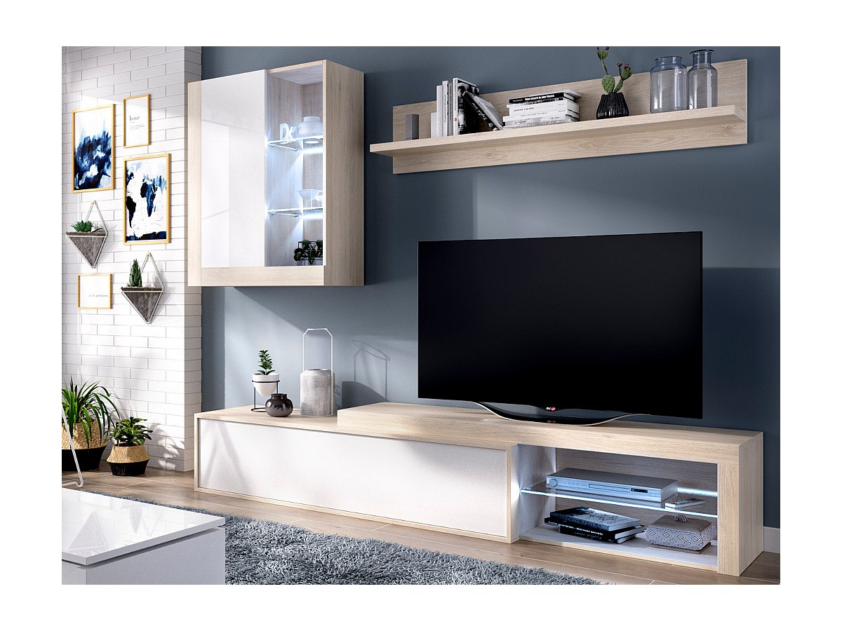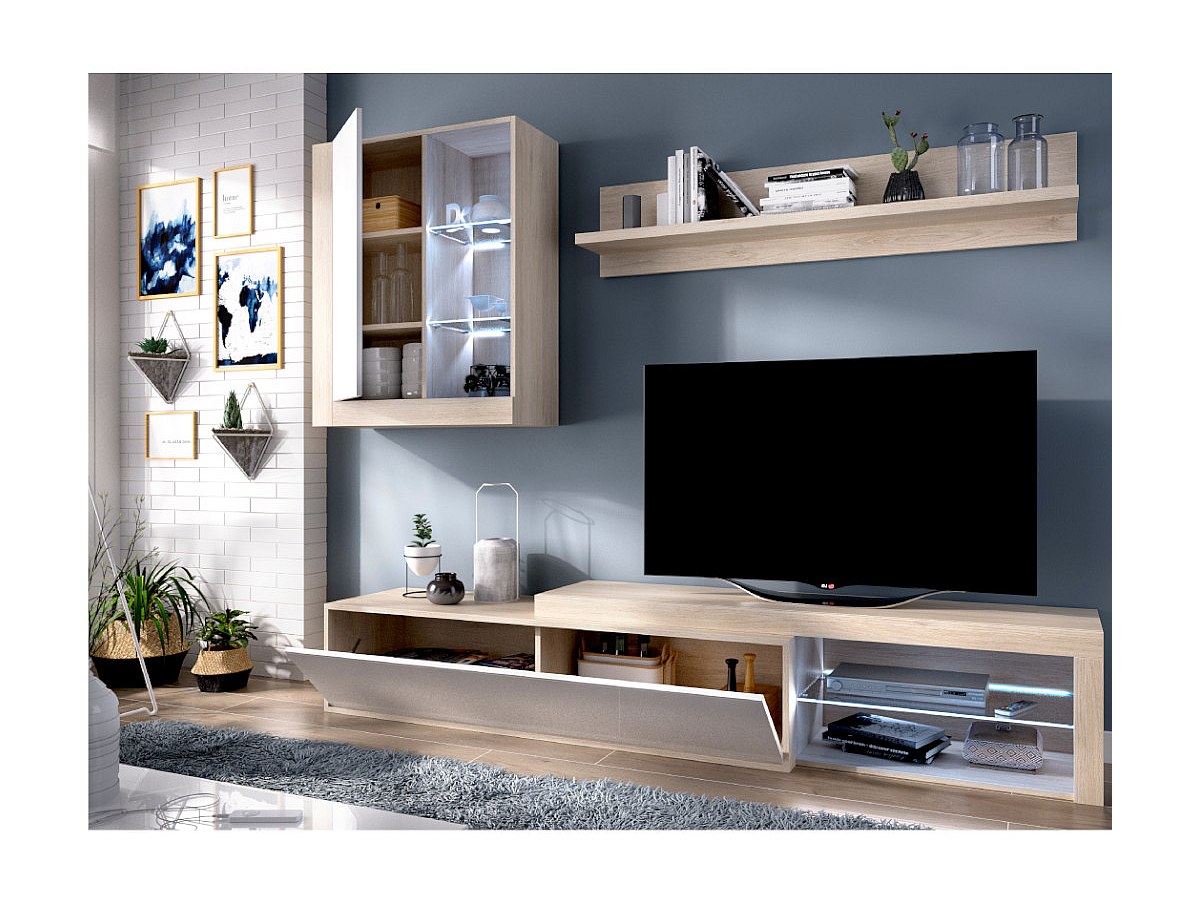 Die Kombination aus Eichenholzfarben, Weiß und Glas verleiht der TV-Wand AKABA einen zeitgenössischen Look, der sich perfekt in Ihr Wohnzimmer einfügt. Mit den integrierten LEDs wird die TV-Wand AKABA Ihre Fernsehabende mit Familie oder Freunden verschönern. Außerdem ist die Wand mit zahlreichen Stauräumen ausgestattet und daher sehr praktisch.