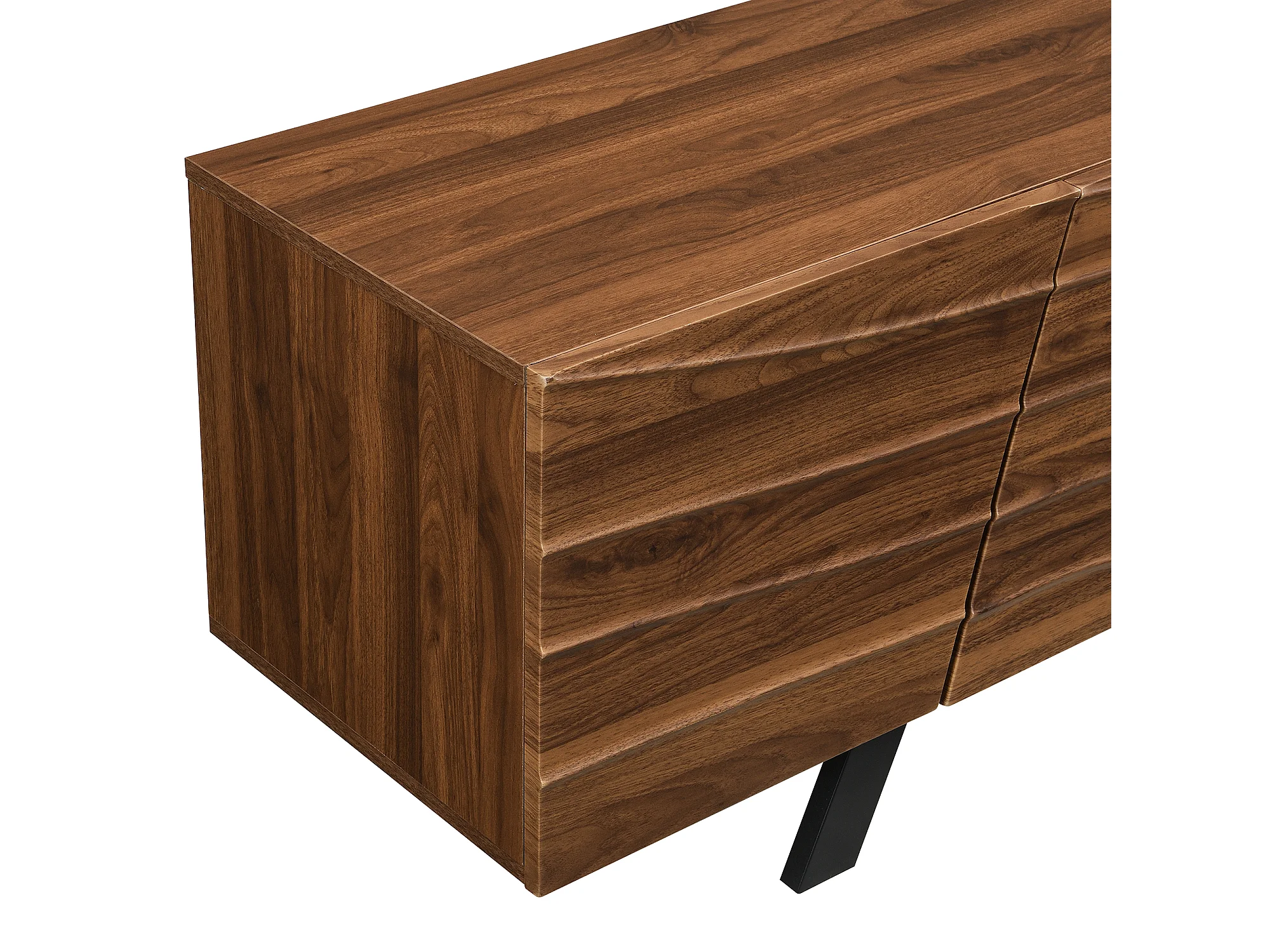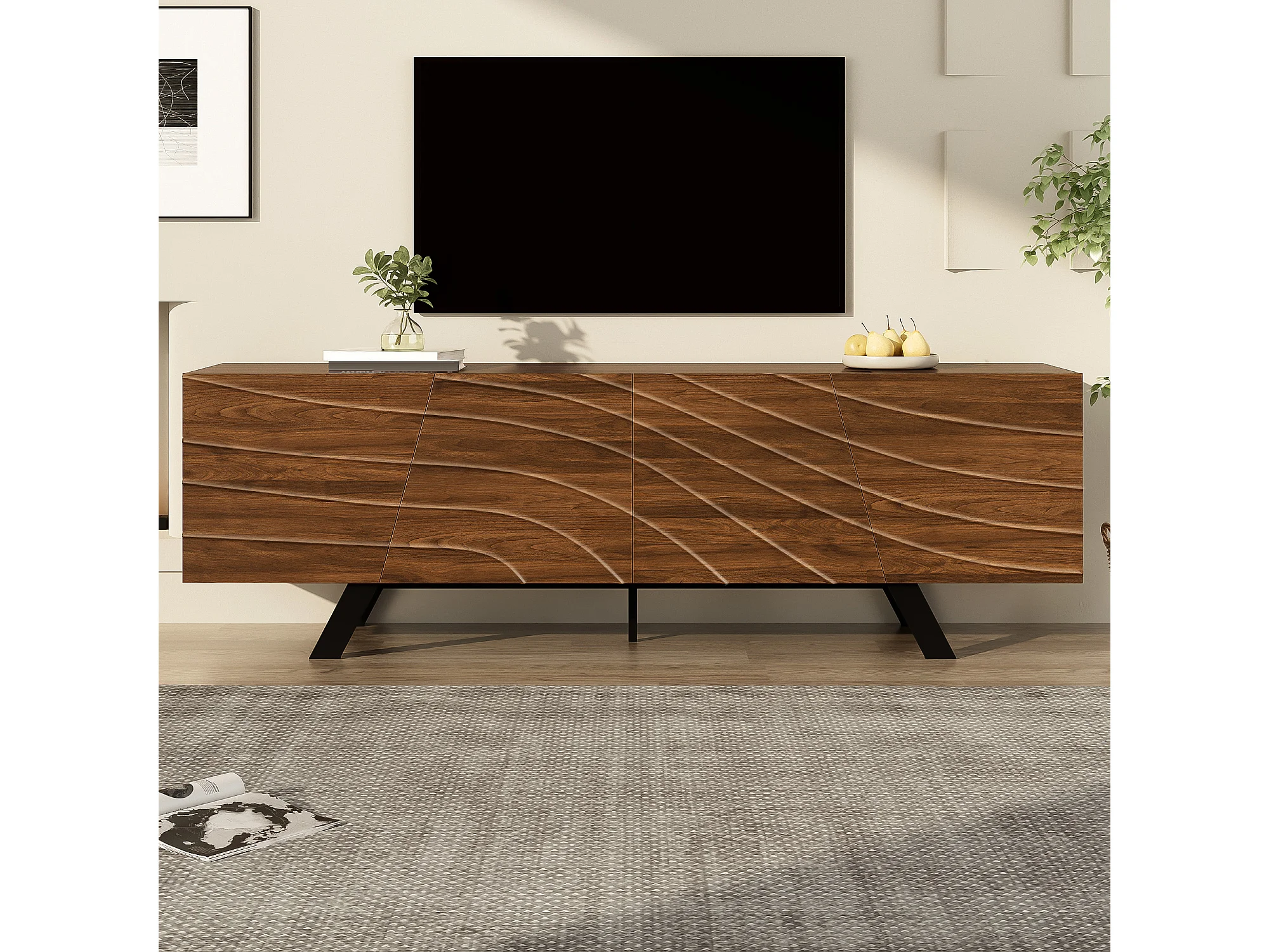 TV-Ständer mit geschwungener Front – Walnuss-Finish mit Eisenbeinen und 4 Türen – 160 x 39 x 50,5 cm – MDF – braun