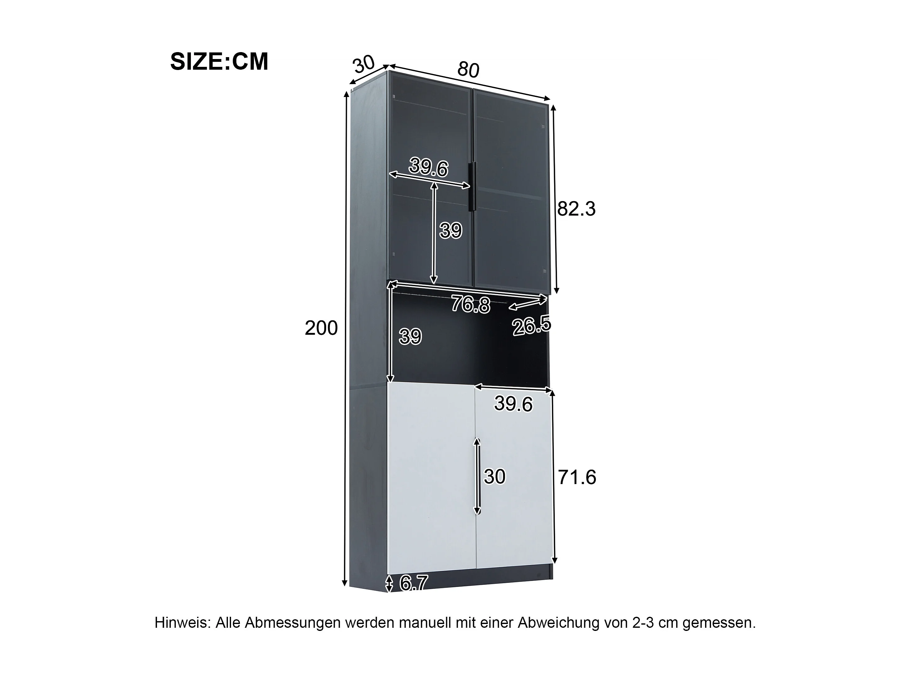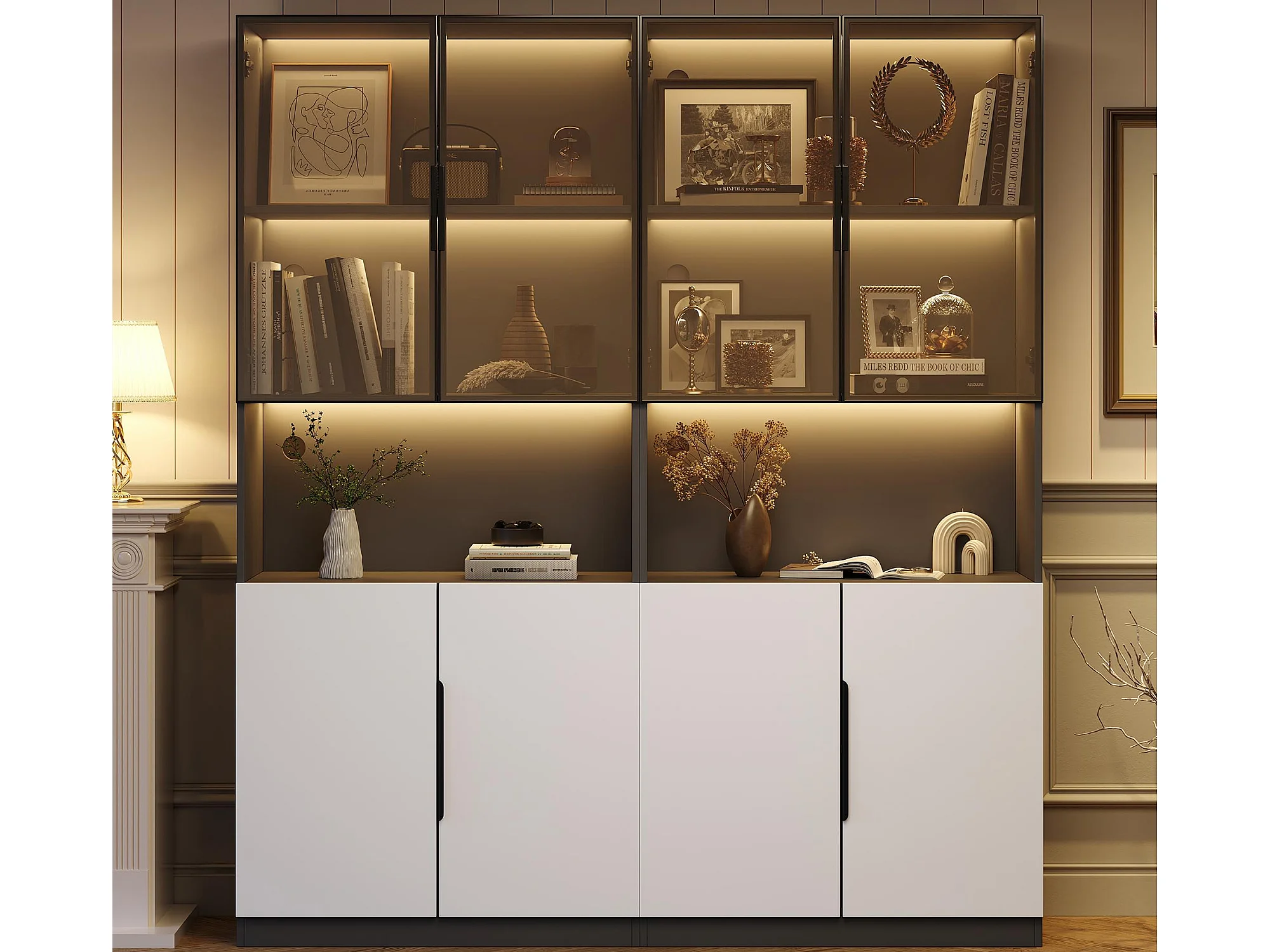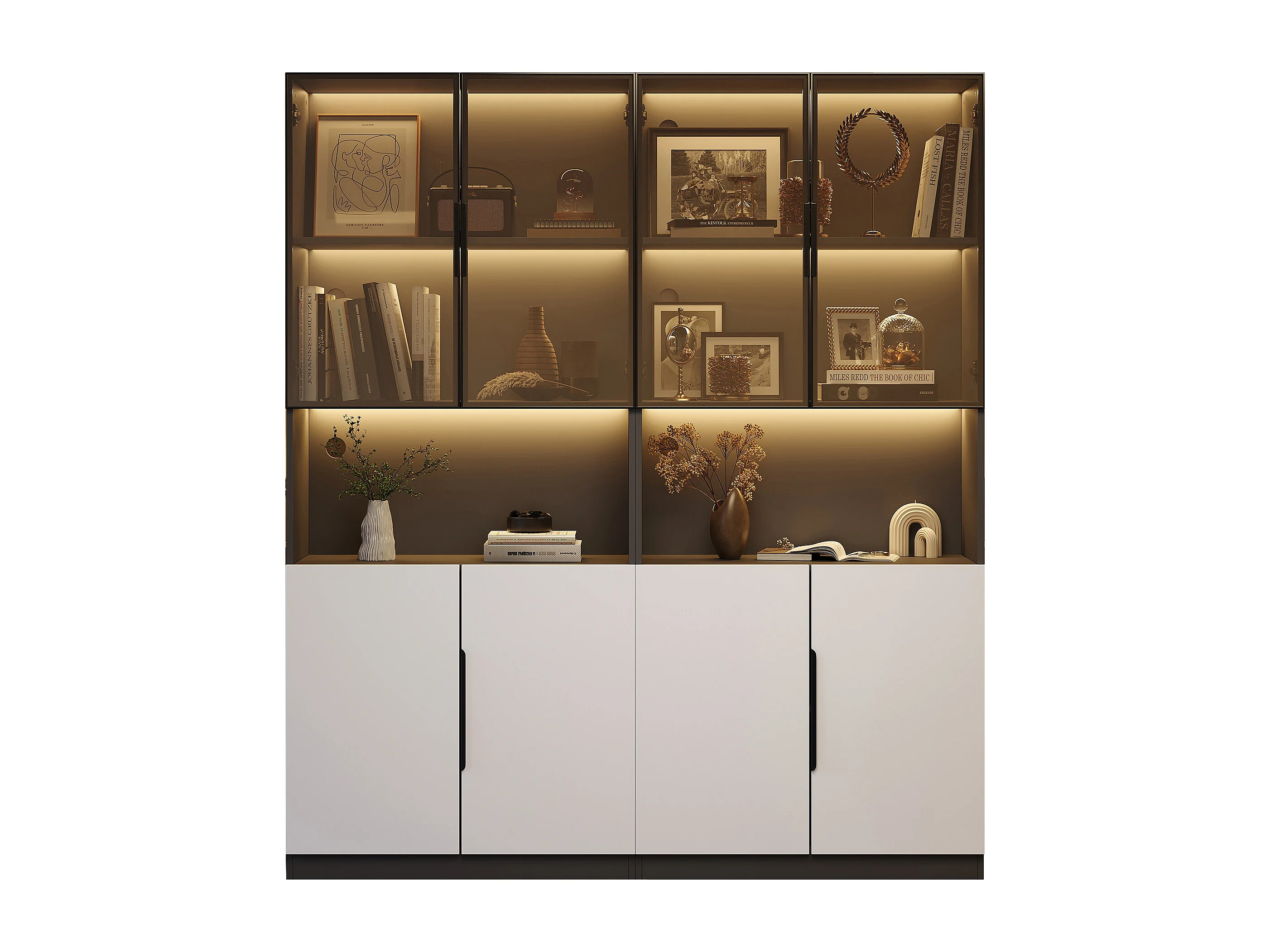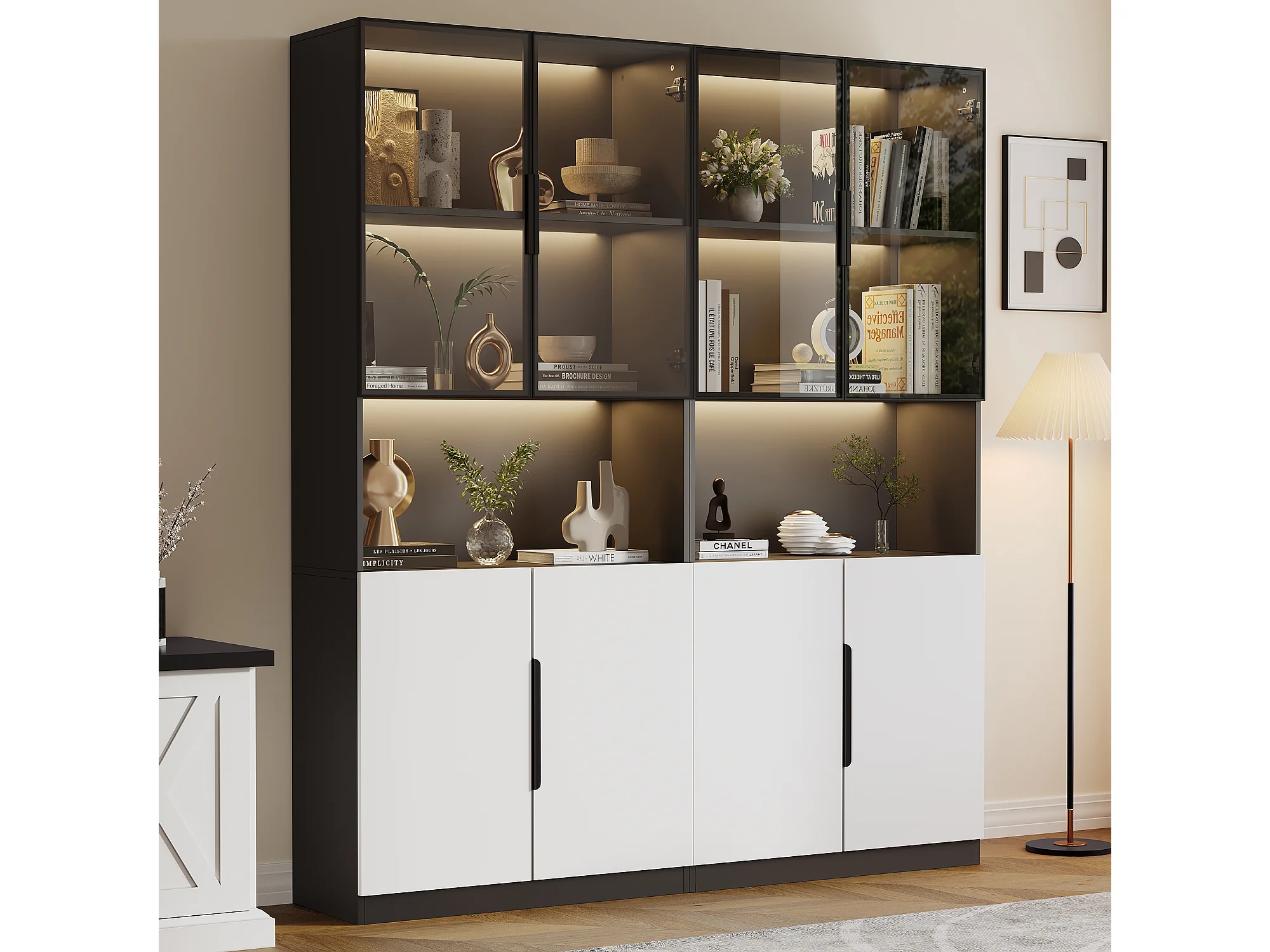 Vitrine 160x30x200 cm mit LED - 8 Türen (4 Glastüren) - Weiß & Schwarz