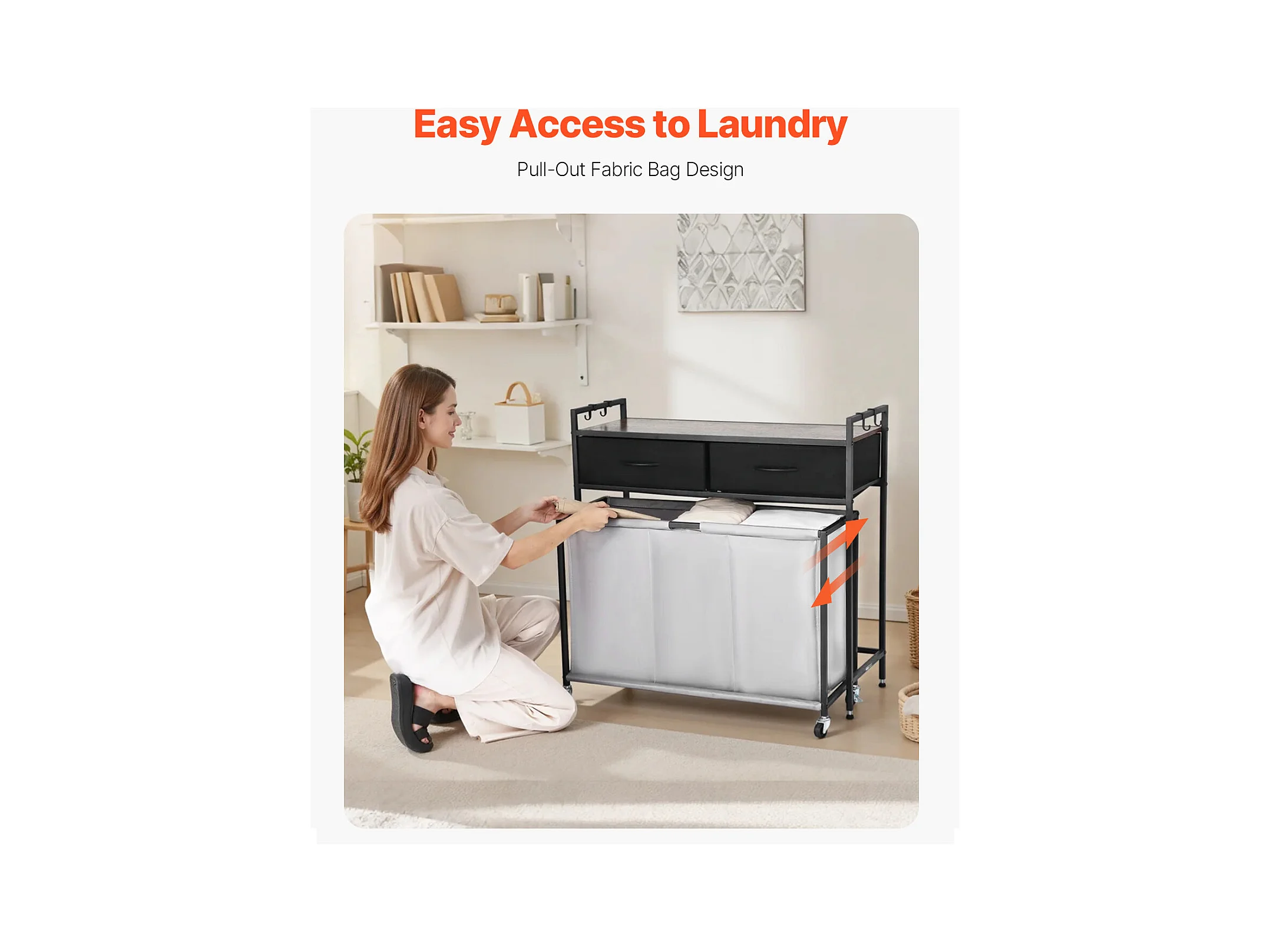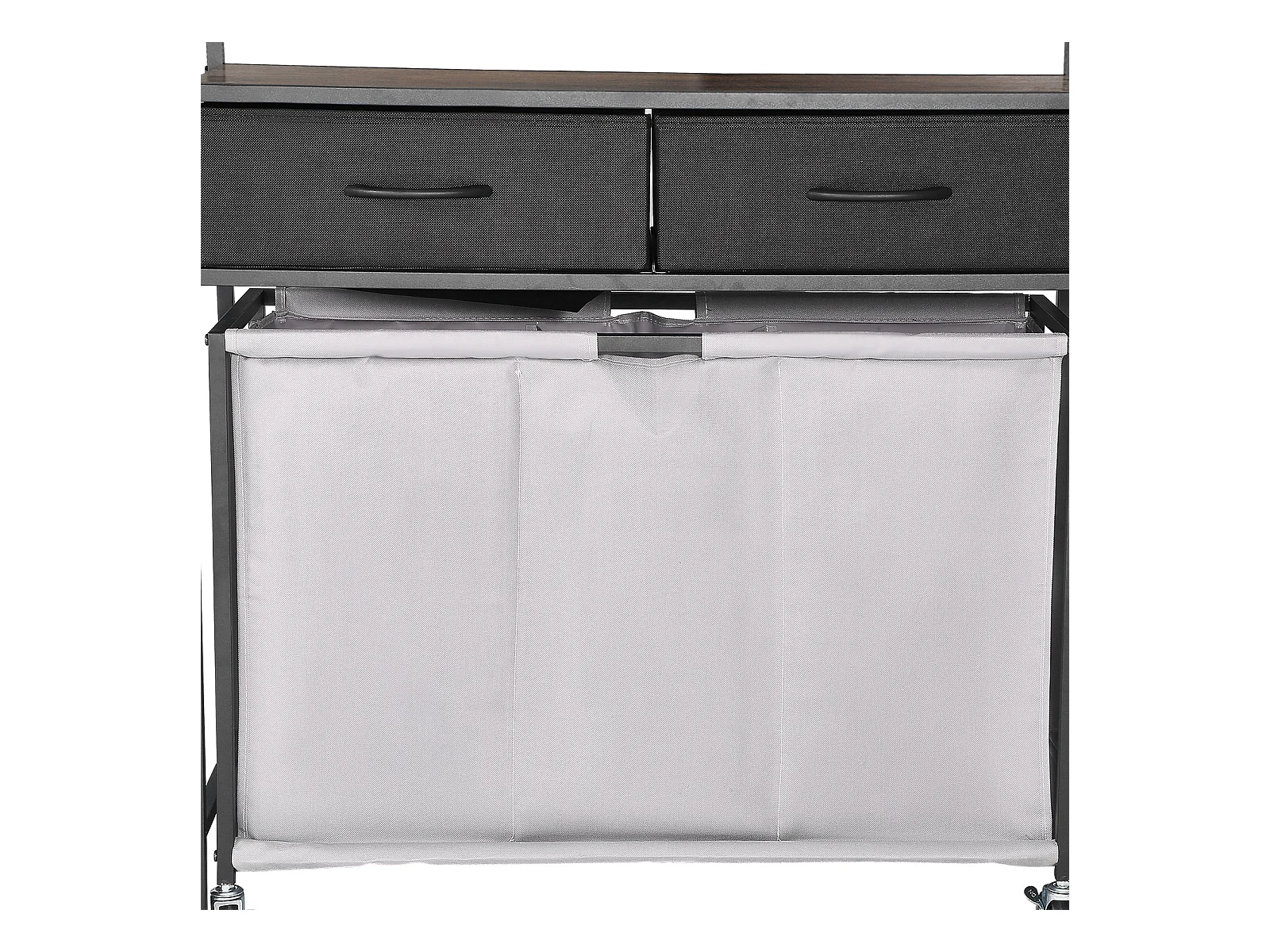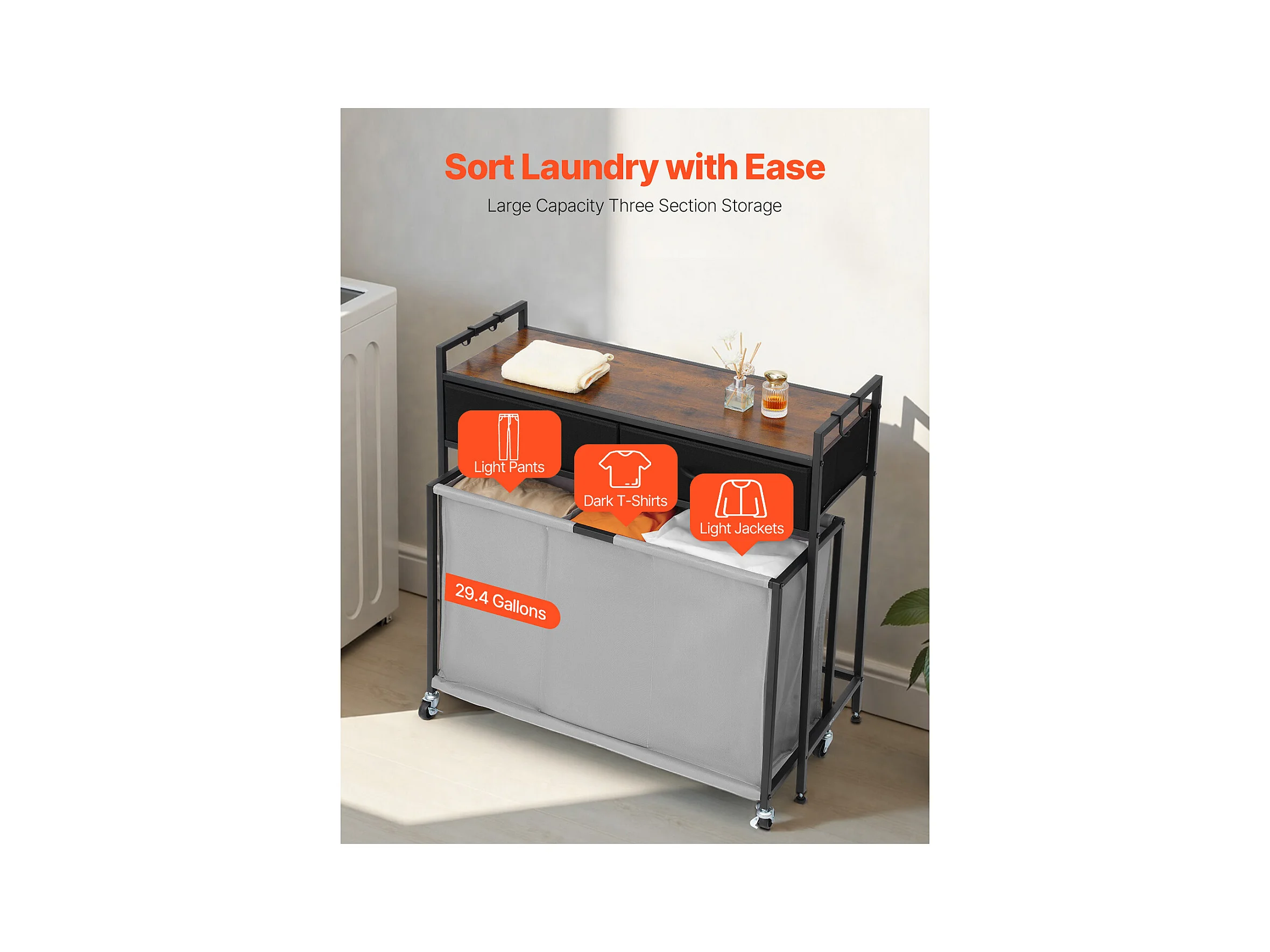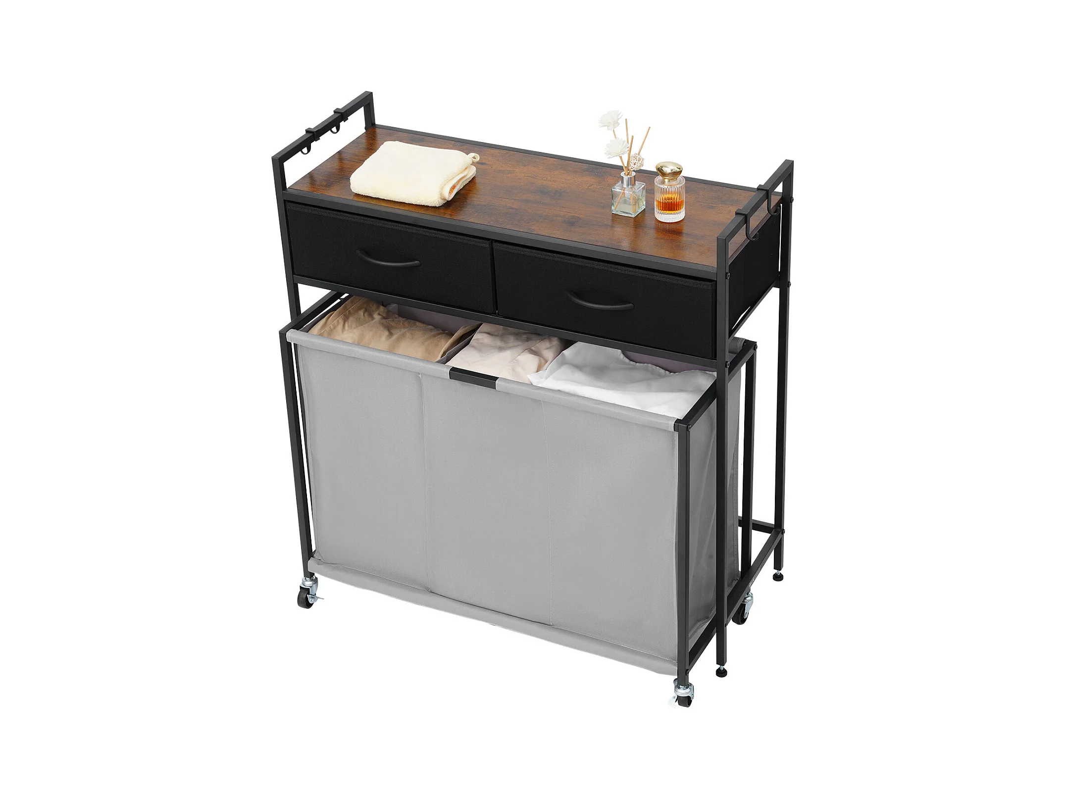 Wäschekorb SucceBuy Wäschesammler mit 3 Fächern und Rollen, Ausgestattet mit einem Herausziehbaren Beutel, einem Holzdeckel, 2 Schubladen und Haken