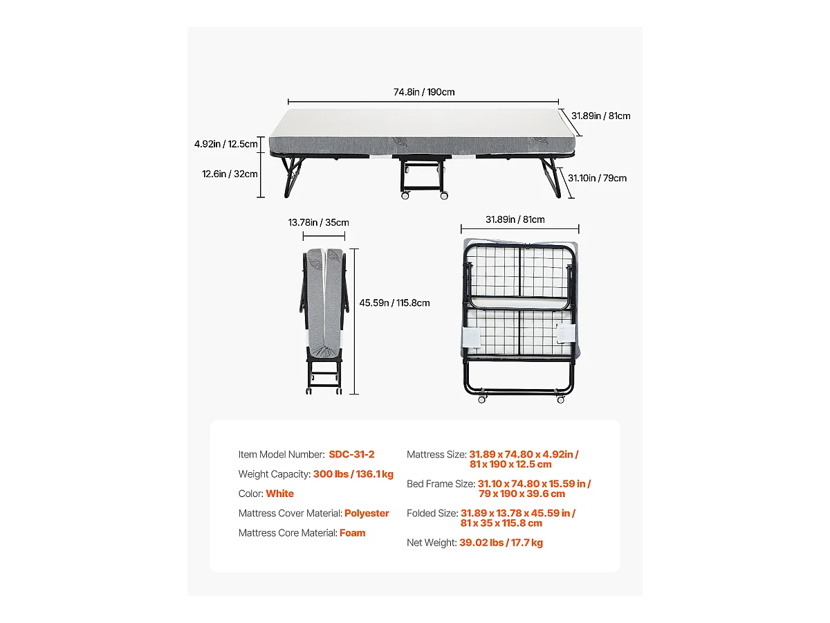 Zusatzbett SucceBuy, Klappbett mit 13 cm Schaumstoffmatratze für Erwachsene und Gäste